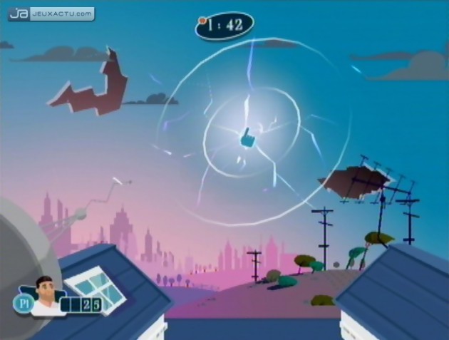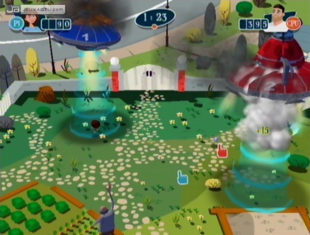Ca tombe plutôt bien car le titre s’inscrit dans la lignée des jeux familiaux où seule l’utilisation de la Wiimote suffit à provoquer des fous-rires. En théorie seulement, car quand bien même Lexis Numérique s’est creusé la tête pour établir un véritable background avec la famille Stevens, les mini-jeux proposés sont loin d’être épatants. On se retrouve ainsi embringué dans les mésaventures de cette famille un peu loufoque, prise au piège par une machine autonome qui a décidé de foutre le dawa dans la maison. Une machine infernale qui fera même office de big boss à la toute fin du jeu, une fois que l’ensemble des épreuves aura été débloquée. En fait, la carence vient surtout du nombre d’épreuves, 17 au total, ce qui est bien trop faible pour tenter de faire jeu égal avec des pointures telles que Mario Party qui dispose de plus d’une cinquantaine de défis, ou dans une moindre mesure les Lapins Crétins qui peuvent compter sur leur bagout pour faire oublier leur piètre prestation. C’est d’autant plus regrettable car certaines épreuves de Chaos à la Maison ont le mérite d’être assez originaux, comme cette fuite d’eau grandeur nature qui nous oblige à sauver le maximum de meubles de la maison. Le saut à l’élastique où l’on nous demande de catapulter Alex vers le bureau de son père pour récupérer des tubes, ou bien encore Somnambules où l’objectif est d’empêcher les intrus de réveiller les membres de la famille. Toutes ces épreuves font preuve d’originalité et se révèlent également amusants à jouer. Malheureusement, l’euphorie sera de courte durée puisque le reste des mini-jeux manquent sévèrement d’inventivité. Entre les fissures à réparer et les personnages à cibler pour les ensuite les déplacer, on a quasiment fait le tour de la question. Forcément, en n’utilisant uniquement la Wiimote, les mouvements à réaliser devant son téléviseur sont minimes et l’on se retrouve à faire les mêmes gestes tout au long de l’aventure. Qu’importe, celle-ci se montre plutôt brève et il ne vous faudra pas plus de deux heures pour arriver en face du boss et terminer le jeu. Evidemment, tout l’intérêt de Chaos à la Maison réside dans sa replay-value et dans les parties à plusieurs, mais là encore, il faut être sacrément téméraire pour se contenter de si peu de choses.