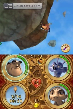"Zoé est une petite fille qui croit aux légendes, pas parce qu'elle est naïve mais parce les légendes, elle aime ça. Afin d'aider son oncle le Seigneur Arnold à se débarrasser d'un terrible dragon, Zoé se met en tête de trouver des héros. Et quand elle tombe sur Gwizdo et Lian-Chu - deux chasseurs de dragon à la petite semaine - et bien tant pis, Zoé décide d'y croire quand même !" Ce pitch récupéré sur le communiqué de presse du film sert aussi de trame à l’adaptation en jeu vidéo de Chasseurs de Dragons, dans le sens où le jeu nous invite à prendre les commandes de notre trio de héros atypiques. La particularité de Chasseurs de Dragons réside dans la possibilité de contrôler à tour de rôle - et comme bon nous semble, en touchant l’icône correspondante via l’écran tactile - les trois protagonistes mis à notre disposition. Bien évidemment, chacun de ces personnages dispose de caractéristiques bien distinctes, vous l’aurez décelé. Gwizdo, grâce à sa silhouette chétive, est plutôt rapide et sa spécialité est de pouvoir réaliser des sauts de grande ampleur. Mieux, en appuyant deux fois sur la touche de saut, il est capable d’exécuter un double saut. Lian-Chu à l’inverse possède une forte corpulence qui le prive des performances de son camarade svelte. En revanche, il peut compter sur sa force brute pour asséner des coups puissants, mais aussi utiliser ses armes pour tuer les ennemis à distance. Reste alors Hector, animal de poils qui possède la faculté de se mettre en boule pour ainsi passer dans des passages à première vue inaccessibles. Il peut également se cacher dans des endroits indiqués sur la carte, afin d’échapper à des pièges fumeux. Jusque-là, rien de bien exceptionnel, Chasseurs de Dragons s’inscrit dans la lignée des jeux de plates-formes classiques qui pullulent sur DS. Et c’est bien là son grand problème, à savoir nous proposer un gameplay ultra classique et beaucoup trop linéaire pour qu’on s’y attarde plus longuement. A la rigueur, la seule originalité du titre réside dans le système de planètes avec centre de gravité et qui permet de se balader la tête en bas, un peu de la même manière qu'un certain Super Mario Galaxy. Si les graphismes restent satisfaisants pour un titre 3D sur DS, les environnements sont pauvres et manquent singulièrement de charme pour attirer notre attention. Le concept de scrolling horizontal renvoie aux vieux titres des années 80, l’effort est saluable, mais à aucun moment Chasseurs de Dragons parvient à se démarquer des autres productions du genre. Ajoutons à cela des actions répétitives, ultra molles et pour la plupart du temps sans intérêt et vous saurez à quoi vous en tenir.
