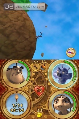 "Zoé est une petite fille qui croit aux légendes, pas parce qu'elle est naïve mais parce les légendes, elle aime ça. Afin d'aider son oncle le Seigneur Arnold à se débarrasser d'un terrible dragon, Zoé se met en tête de trouver des héros. Et quand elle tombe sur Gwizdo et Lian-Chu - deux chasseurs de dragon à la petite semaine - et bien tant pis, Zoé décide d'y croire quand même !" Ce pitch récupéré sur le communiqué de presse du film sert aussi de trame à l’adaptation en jeu vidéo de Chasseurs de Dragons, dans le sens où le jeu nous invite à prendre les commandes de notre trio de héros atypiques. La particularité de Chasseurs de Dragons réside dans la possibilité de contrôler à tour de rôle - et comme bon nous semble, en touchant l’icône correspondante via l’écran tactile - les trois protagonistes mis à notre disposition. Bien évidemment, chacun de ces personnages dispose de caractéristiques bien distinctes, vous l’aurez décelé. Gwizdo, grâce à sa silhouette chétive, est plutôt rapide et sa spécialité est de pouvoir réaliser des sauts de grande ampleur. Mieux, en appuyant deux fois sur la touche de saut, il est capable d’exécuter un double saut. Lian-Chu à l’inverse possède une forte corpulence qui le prive des performances de son camarade svelte. En revanche, il peut compter sur sa force brute pour asséner des coups puissants, mais aussi utiliser ses armes pour tuer les ennemis à distance. Reste alors Hector, animal de poils qui possède la faculté de se mettre en boule pour ainsi passer dans des passages à première vue inaccessibles. Il peut également se cacher dans des endroits indiqués sur la carte, afin d’échapper à des pièges fumeux. Jusque-là, rien de bien exceptionnel, Chasseurs de Dragons s’inscrit dans la lignée des jeux de plates-formes classiques qui pullulent sur DS. Et c’est bien là son grand problème, à savoir nous proposer un gameplay ultra classique et beaucoup trop linéaire pour qu’on s’y attarde plus longuement. A la rigueur, la seule originalité du titre réside dans le système de planètes avec centre de gravité et qui permet de se balader la tête en bas, un peu de la même manière qu'un certain Super Mario Galaxy. Si les graphismes restent satisfaisants pour un titre 3D sur DS, les environnements sont pauvres et manquent singulièrement de charme pour attirer notre attention. Le concept de scrolling horizontal renvoie aux vieux titres des années 80, l’effort est saluable, mais à aucun moment Chasseurs de Dragons parvient à se démarquer des autres productions du genre. Ajoutons à cela des actions répétitives, ultra molles et pour la plupart du temps sans intérêt et vous saurez à quoi vous en tenir.