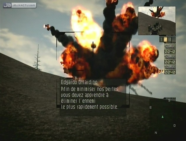 D’autant plus que dans Chromehounds, les munitions ne poussent pas aux coins des rues. Quand il n’y en a plus, ben… il n’y en a plus. Soyez donc économe et visez si possible avec précision vos ennemis. D’ailleurs, leur réaction au combat est prévisible. S’il sont immobiles lorsqu’ils lancent l’assaut ou reçoivent une décharge de plombs, ils commencent à se mouvoir ensuite. On comprend bien vite comment viser et faire mouche même de loin. Heureusement, qu’un Mode FPS est là pour affiner sa visée. En cliquant sur le stick droit, vous basculerez à la première ou à la troisième personne en un clin d’œil sans pour autant perdre de vue l’angle de caméra précédent grâce à un multifenêtrage. Hélas, c’est un brin répétitif de devoir toujours changer de vue au moindre adversaire, tout comme devoir afficher la carte détaillé de la mission en pressant Y. Mémorisez bien les consignes de vos supérieurs en début d’épreuve car ils ne les répèteront pas et n’il y a aucun moyen d’afficher ce briefing (sic). Et si vous vous mélangez les pinceaux, il n’y a plus qu’à attendre patiemment l’échec de la mission.