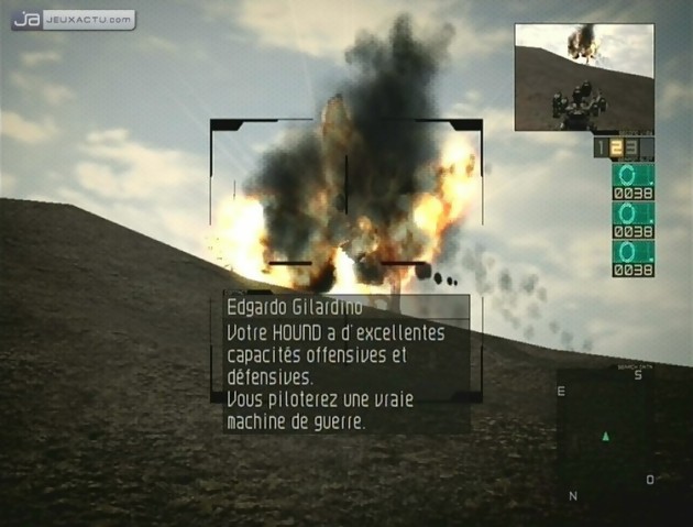 Les "combas" sont des antennes de communications qui permettent de mieux quadriller les champs de bataille et vous indiquant quelles sont les cibles mobiles aux alentours. Vous comprendrez donc que lorsqu’un ennemi fait le mort, il est impossible pour votre hiérarchie d’indiquer clairement sa position. Cette technique de planqué marche également dans l’autre sens. Grosso modo, si vous voulez réalisez une bonne attaque, planquez-vous dans les fourrées et surgissez d’un seul coup pour surprendre l’adversaire. Cette tactique est essentielle pour les missions offensives où l’on vous demandera d’éliminer tous les ennemis affichés à l’écran, détruire un quartier général ou poursuivre un mercenaire peu enclin aux discussions autour d’un bon café. Défensivement, vous devez au contraire être très mobile pour ne pas vous faire pulvériser comme un vulgaire insecte tout en jetant un coup d’œil salvateur à vos coéquipiers en perdition. A la fin de chaque mission, vous débloquerez équipements et objets utiles pour monter votre propre mech ou Hounds dans le jargon du jeu. Le Mode Garage vous permet de construire comme bon vous semble votre robot de guerre en choisissant son armature, son système de déplacement, son arsenal ou même sa couleur. Bien évidemment, certains choix auront des conséquences sur la mobilité de votre engin, sur sa résistance ou sur sa puissance de feu. Et il faut faire donc très attention au poids des équipements et à leur emplacement car une mitrailleuse visant les nuages n’est pas très utile.