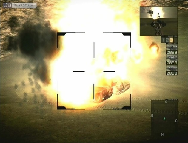 D’autant plus que dans Chromehounds, les munitions ne poussent pas aux coins des rues. Quand il n’y en a plus, ben… il n’y en a plus. Soyez donc économe et visez si possible avec précision vos ennemis. D’ailleurs, leur réaction au combat est prévisible. S’il sont immobiles lorsqu’ils lancent l’assaut ou reçoivent une décharge de plombs, ils commencent à se mouvoir ensuite. On comprend bien vite comment viser et faire mouche même de loin. Heureusement, qu’un Mode FPS est là pour affiner sa visée. En cliquant sur le stick droit, vous basculerez à la première ou à la troisième personne en un clin d’œil sans pour autant perdre de vue l’angle de caméra précédent grâce à un multifenêtrage. Hélas, c’est un brin répétitif de devoir toujours changer de vue au moindre adversaire, tout comme devoir afficher la carte détaillé de la mission en pressant Y. Mémorisez bien les consignes de vos supérieurs en début d’épreuve car ils ne les répèteront pas et n’il y a aucun moyen d’afficher ce briefing (sic). Et si vous vous mélangez les pinceaux, il n’y a plus qu’à attendre patiemment l’échec de la mission.