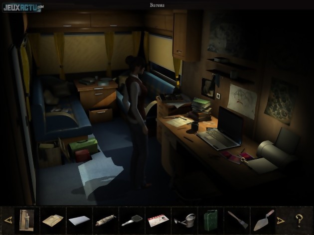 Ainsi, on ne se retrouve jamais vraiment bloqué sans savoir quoi faire. L'héroïne distille souvent de discrètes indications sur les objectifs en cours ou sur les moyens de les accomplir. Et si l'on essaye de quitter un lieu avant d'avoir réalisés toutes les actions nécessaires au bon déroulement de l'aventure, Mademoiselle Leroux ne se contente pas d'un laconique "je ne peux pas encore partir" mais précise ce qu'elle attend de nous. La progression dans le jeu est donc très fluide, d'autant que les situations et les énigmes ne manquent jamais de logique. Parfois, même, elles ne sont pas assez tarabiscotées. Quand on trouve une truelle et un pinceau sur un site de fouilles, ou encore un burin et un marteau à côté d'une caisse fermée par des clous, il n'y a pas vraiment de question à se poser sur leur usage. Heureusement, certaines énigmes demandent tout de même un peu plus de réflexion de la part du joueur. Ceux qui auraient du mal pourront toujours faire appel à la fonction d'affichage des zones importantes, qui commence à devenir quasiment systématique dans les jeux d'aventure mais qui diffère quelque peu ici. En effet, les personnages avec qui l'on peut dialoguer et les zones à regarder ne sont pas indiqués. On pourrait penser que cela complique quelque peu la tâche mais en réalité, c'est l'inverse qui se produit. Premièrement car, de toutes manières, personne ne pourrait louper involontairement un homme ou une femme planté dans le décor. Et puisque cette fonction d'aide n'affiche que les zones interactives, on peut tout à fait parcourir le jeu sans jamais s'arrêter sur les éléments de décor simplement observables. Ce que nous ne vous recommandons pas car la durée de vie de l'aventure est déjà très faible en soi. On dénombre ainsi moins de vingt interlocuteurs dans tout le jeu et guère plus de lieux différents. Pour le coup, il s'agit d'un véritable défaut puisque six heures suffisent largement à boucler le scénario, notamment si vous avez la fâcheuse habitude de lire les sous-titres et donc de zapper les dialogues avant leur fin. Signalons à ce propos qu'il est en revanche impossible de passer les monologues. Lorsque Sylvie décrit un objet ou commente d'elle-même une situation, vous n'avez d'autre choix que de l'écouter jusqu'au bout, même lorsque vous avez déjà entendu la phrase auparavant. Autre petit souci de finition : le jeu est ponctué de scènes cinématiques aussi courtes que disgracieuses, ce qui ne contribue pas à l'élever vers des sommets. Au final, il faut donc se contenter d'un petit jeu d'aventures relativement plaisant, mais jamais enthousiasmant.