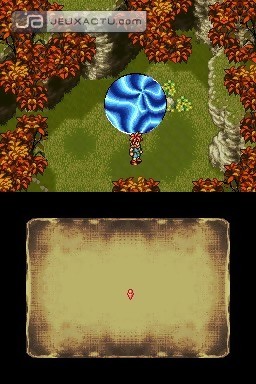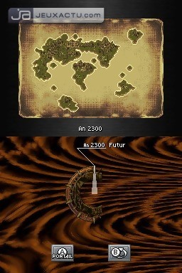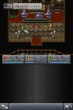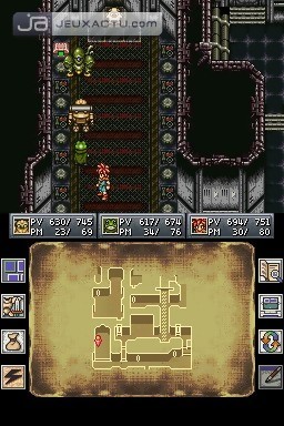 A contre-courant de sa politique actuelle, Square Enix n’a pas offert de refonte graphique à Chrono Trigger. Un moindre mal pour quiconque aura connu l’œuvre d’origine, mais qui pourrait pousser certains joueurs peu habitués à la 2D, aussi belle soit-elle, à faire l’impasse sur le titre. Un manque d’ouverture forcément dommageable, d’autant que quelques efforts ont été apportés à l’interface afin de la rendre plus lisible. En ce sens, le mode DS, par opposition au mode "Classique", proposé en début de partie fait presque figure d’incontournable si l’on veut profiter de manière optimale des combats. La totalité des fenêtres et informations étant en effet déplacées sur l’écran tactile pour faciliter la navigation. Certes, les menus ne ressemblent pas trait pour trait à ceux d’origine, mais ils ont le mérite d’enlever un point négatif tout trouvé pour certains. Pour finir, impossible de faire l’impasse sur les ajouts à proprement parlé de cette version DS. Toujours à prendre pour ce qu’ils sont, c'est-à-dire des extras, ils oscillent, il fallait s’y attendre, entre le sympathique et le totalement anecdotique. Et comme souvent, c’est certainement ce qui aura demandé le plus de travail aux développeurs qui se révèlera le moins mémorable. En effet, si l’on appréciera de pouvoir visionner à l’envie artworks et autres scènes animées débloquées durant l’aventure, celles-là mêmes qui agrémentent la version PSone, on peine franchement à croire que les joueurs seront nombreux à se ruer sur le mini-jeu de combat de monstres. Compatibilité Wi-Fi ou non. Mis à part quelques changements de noms qui froisseront les anciens ayant connu une quelconque version américaine, la traduction se montre, pour sa part, à la hauteur de l’évènement. Un strict minimum.