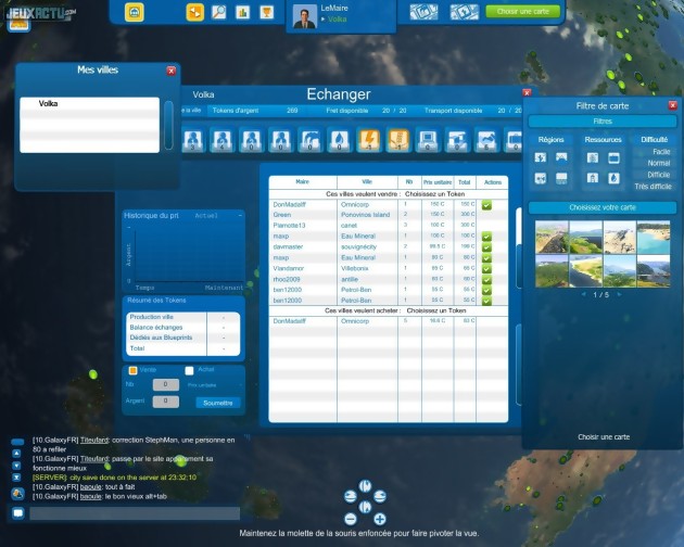 Manifestement inspirés par les MMORPG, les développeurs nous proposent avant toute chose de créer notre avatar virtuel. Même s'il utilise un style très cartoon, l'outil de création de personnage ne manque pas de subtilité puisque l'on peut modeler à sa guise les moindres détails du corps et du visage. Hélas, cette précision ne sert pas à grand chose dans la pratique car l'avatar a en réalité tout du gadget inutile. On peut certes s'en servir pour visiter les villes concurrentes, mais puisqu'il se téléporte instantanément là où on pointe le curseur et qu'aucune interaction avec l'environnement n'est possible, il ne fait concrètement rien de plus qu'une caméra virtuelle. Et ce ne sont pas les quelques postures disponibles (danser, tousser, faire le singe...) qui changeront la donne puisque le manque d'intérêt global des avatars fait qu'on n'en croise quasiment jamais d'autres que le sien lorsqu'on visite une ville. Les discussions entre joueurs ont plutôt lieu à travers la fenêtre de chat disponible aussi bien sur la vue générale de la planète que dans l'écran de création de ville. Comme tout canal général, il possède son lot de pénibles et d'illettrés mais, heureusement, on peut interagir avec les différentes villes de la planète sans forcément avoir à taper le bout de gras avec leurs créateurs. L'intérêt du mode en ligne consiste en effet dans la possibilité d'échanges de ressources, que l'on peut négocier à travers un panneau d'échanges qui regroupe les différentes offres d'achat et de vente disponible. Que votre ville produise trop de bureaux, d'industries high-tech et d'électricité, ou qu'elle soit en manque de travailleurs qualifiés, de traitement des déchets et de carburant, vous trouverez forcément des contrats permettant d'atteindre un meilleur équilibre. Il est même possible de réaliser ces échanges hors du jeu, grâce à la page web personnelle créée automatiquement pour chaque joueur. Cette dernière contient votre profil, votre liste d'amis, vos contrats et vos Blueprints. Ce terme désigne des plans de construction rares et attribués régulièrement par tirage au sort. Une fois obtenus, ils permettent de construire des mégastructures inspirées de bâtiments réels (Tour Eiffel, Empire State Building, Colosse de Rhodes...) et très couteuses en ressources, ce qui oblige encore plus à commercer avec d'autres joueurs. Relativement innovantes et sympathiques, les fonctionnalités en ligne ne sont hélas accessibles qu'en s'abonnant à l'offre "Planète", qui donne droit par ailleurs à des packs mensuels de nouveaux bâtiments. Le risque d'un tel modèle économique ? Celui de donner l'impression aux joueurs solo d'avoir acheté un jeu incomplet...