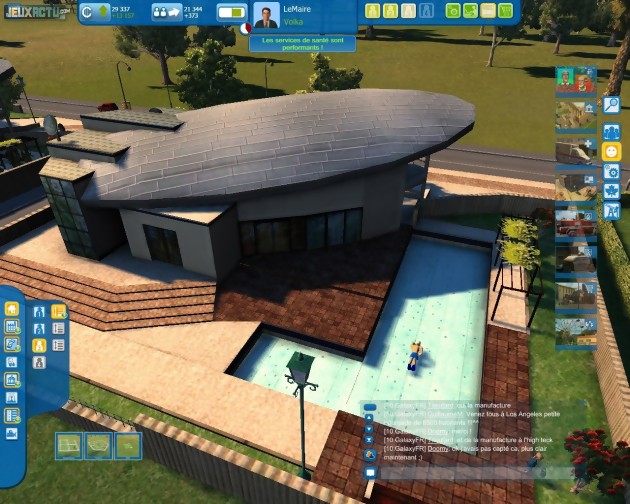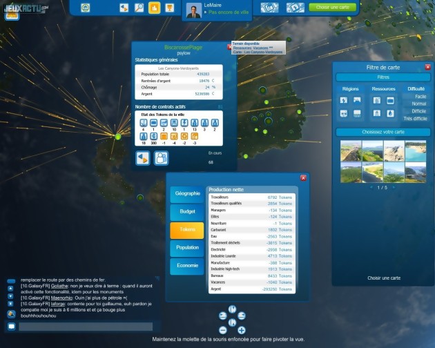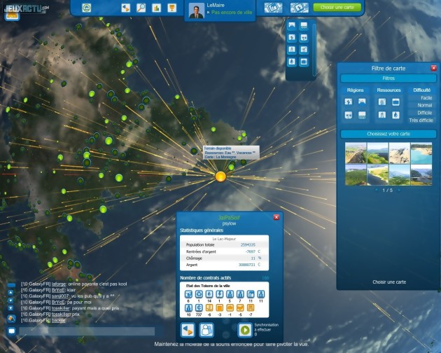 Manifestement inspirés par les MMORPG, les développeurs nous proposent avant toute chose de créer notre avatar virtuel. Même s'il utilise un style très cartoon, l'outil de création de personnage ne manque pas de subtilité puisque l'on peut modeler à sa guise les moindres détails du corps et du visage. Hélas, cette précision ne sert pas à grand chose dans la pratique car l'avatar a en réalité tout du gadget inutile. On peut certes s'en servir pour visiter les villes concurrentes, mais puisqu'il se téléporte instantanément là où on pointe le curseur et qu'aucune interaction avec l'environnement n'est possible, il ne fait concrètement rien de plus qu'une caméra virtuelle. Et ce ne sont pas les quelques postures disponibles (danser, tousser, faire le singe...) qui changeront la donne puisque le manque d'intérêt global des avatars fait qu'on n'en croise quasiment jamais d'autres que le sien lorsqu'on visite une ville. Les discussions entre joueurs ont plutôt lieu à travers la fenêtre de chat disponible aussi bien sur la vue générale de la planète que dans l'écran de création de ville. Comme tout canal général, il possède son lot de pénibles et d'illettrés mais, heureusement, on peut interagir avec les différentes villes de la planète sans forcément avoir à taper le bout de gras avec leurs créateurs. L'intérêt du mode en ligne consiste en effet dans la possibilité d'échanges de ressources, que l'on peut négocier à travers un panneau d'échanges qui regroupe les différentes offres d'achat et de vente disponible. Que votre ville produise trop de bureaux, d'industries high-tech et d'électricité, ou qu'elle soit en manque de travailleurs qualifiés, de traitement des déchets et de carburant, vous trouverez forcément des contrats permettant d'atteindre un meilleur équilibre. Il est même possible de réaliser ces échanges hors du jeu, grâce à la page web personnelle créée automatiquement pour chaque joueur. Cette dernière contient votre profil, votre liste d'amis, vos contrats et vos Blueprints. Ce terme désigne des plans de construction rares et attribués régulièrement par tirage au sort. Une fois obtenus, ils permettent de construire des mégastructures inspirées de bâtiments réels (Tour Eiffel, Empire State Building, Colosse de Rhodes...) et très couteuses en ressources, ce qui oblige encore plus à commercer avec d'autres joueurs. Relativement innovantes et sympathiques, les fonctionnalités en ligne ne sont hélas accessibles qu'en s'abonnant à l'offre "Planète", qui donne droit par ailleurs à des packs mensuels de nouveaux bâtiments. Le risque d'un tel modèle économique ? Celui de donner l'impression aux joueurs solo d'avoir acheté un jeu incomplet...