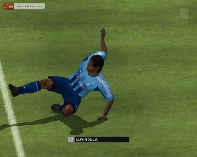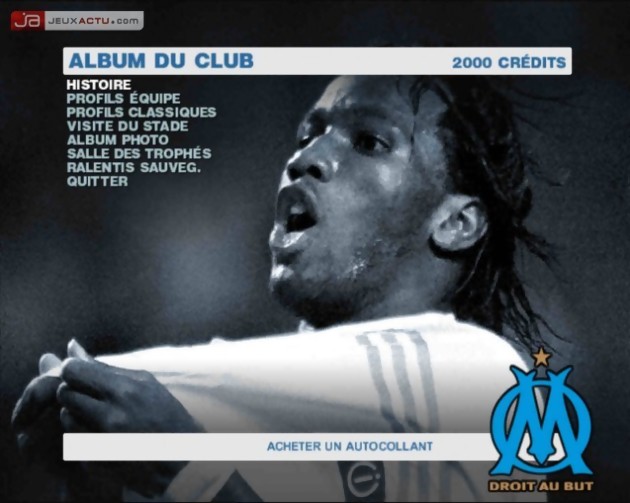 Par bonheur, la version que nous avons pu tester était la version estampillée Olympique de Marseille. S’il avait fallu tester la version PSG, je ne vous aurais pas garanti la totale impartialité de ce test. Tout commence par un petit clip plutôt sympathique, où l’on voit des images de la ville, du stade, des supporteurs et des stadiers qui font la fête tous ensemble (sûrement après un but de Drogba la saison dernière). Ensuite, on se retrouve sur une page d’accueil aux couleurs du club (ici l’OM donc), avec un joueur, choisi aléatoirement dans l’effectif, qui jongle maladroitement à côté des menus. Outre le mode Exhibition, qui vous permet de faire des matchs amicaux avec n’importe quelle équipe, tout l’intérêt, aussi minime soit-il, réside dans le mode « Menu Club ». Vous aurez ici le choix de participer au championnat national ou au trophée européen, sorte de mini ligue des champions avec deux groupes de six équipes, où les deux premiers de chaque groupe se retrouvent en demi finale.