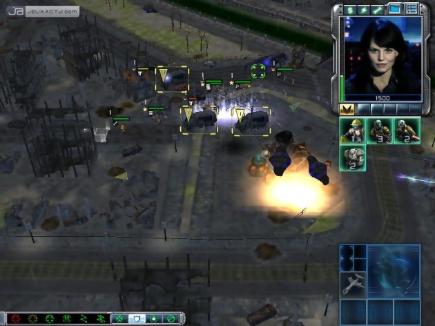 Parfois, plusieurs missions au choix sont proposées mais leur réussite n’a aucune incidence sur l’autre et on doit finalement toutes les accomplir. Dommage. Toutefois, on ne s’ennuie pas un seul instant car les missions sont étonnamment variées de l’une à l’autre. Souvent, la cible prioritaire sera la destruction d’un complexe ou la défense d’une base mais cela ne se limite pas à cela. Souvent, certains niveaux sont d’une rare intensité pour mieux nous plonger dans l’ambiance : escorte sous le feu alien, mission commando et d’infiltration, de secours, destruction de générateurs pour déployer une nouvelle arme ou éviter de se prendre une bombe nucléaire dans la tronche, etc. En complément, de nombreux objectifs vous sont proposés. Généralement, leur accomplissement peut vous donner un petit coup de pouce par la suite (par exemple la réactivation d’une centrale alimentant les défenses d’un poste avancé) mais constitue également un challenge supplémentaire. Dans le même ordre d’idée, il faut fouiller la map de fond en comble pour obtenir des renseignements sur l’histoire et les unités de chaque nation. La réussite de tous les objectifs primaires, objectifs secondaires et de prise de renseignement est respectivement sanctionnée par l’obtention d’une médaille. Si cette diversité donne un certain cachet aux campagnes, la narration entre deux cartes les rend incontournables. Electronic Arts n’a pas fait les choses à moitié et s’est offert le luxe de nous proposer près d’une heure et demi de cinématiques filmées avec de véritables acteurs. Un casting de malade ! On reconnaît aisément les traits de Michael Ironside (la série TV "V", Robocop, Starship Troopers, The Machinist, etc.) et de Josh Holloway (désormais célèbre pour sa prestation dans la série Lost). Cerise sur le cake, on n’aura pas à rougir face à nos amis américains puisque la version française du jeu est correctement doublée. Conforté par ces cut-scenes, EA a également mis les bouchées doubles au niveau du background. Le look des unités en jette vraiment et elles sont toutes bien animées. C’est un vrai spectacle que de les voir se mouvoir et entrer en action. Et le moteur de particule fait son boulot à merveille dans les moments les plus chauds : tir laser de partout, bombardement aérien, destruction de bâtiments dans un nuage de fumée, jeu de lumière dynamique lors de l’utilisation d’une super-arme (comme le canon à ion ou la bombe atomique). Les effets sont époustouflants et on baigne en pleine science-fiction. Quant aux environnements, leur qualité est variable mais ils souvent quelconques. On ne boude pas notre plaisir pour autant et c’est donc un bel update graphique que Command & Conquer s’est offert depuis le dernier épisode. De plus, le titre est bien optimisé puisque l’on a constaté aucun bug ni aucun temps de latence. Une qualité rare de nos jours. Enfin, le travail se veut tout aussi impeccable au niveau de la bande sonore. Well done !