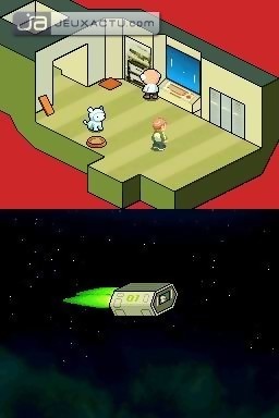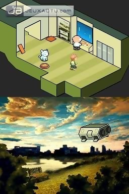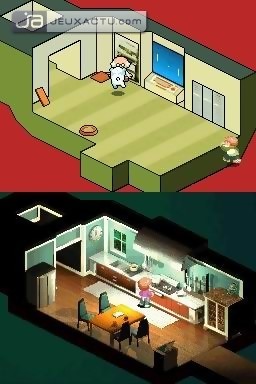 Contact est assurément un jeu mignon et bien coloré. La patte graphique est d’autant appréciable on retrouve le même esprit de décalage : si l’écran inférieur met en avant le souci du détail, l’écran supérieur représentant la salle du professeur est volontairement épuré. Il laissera parfois sa place pour que l’écran supérieur soit un prolongement direct de l’écran inférieur ou pour visualiser un autre endroit de la carte (une herse s’abaissant ou un personnage en détresse). Si l’écran supérieur est bien utilisé, on ne peut pas en dire autant du stylet. Indispensable pour naviguer entre les menus, son imprécision concernant les déplacements font qu’on lui préférera vite le bon vieux pad directionnel.