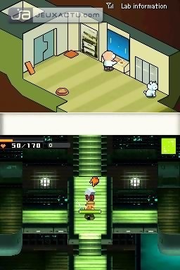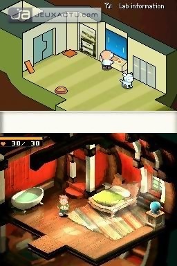 Contact est assurément un jeu mignon et bien coloré. La patte graphique est d’autant appréciable on retrouve le même esprit de décalage : si l’écran inférieur met en avant le souci du détail, l’écran supérieur représentant la salle du professeur est volontairement épuré. Il laissera parfois sa place pour que l’écran supérieur soit un prolongement direct de l’écran inférieur ou pour visualiser un autre endroit de la carte (une herse s’abaissant ou un personnage en détresse). Si l’écran supérieur est bien utilisé, on ne peut pas en dire autant du stylet. Indispensable pour naviguer entre les menus, son imprécision concernant les déplacements font qu’on lui préférera vite le bon vieux pad directionnel.