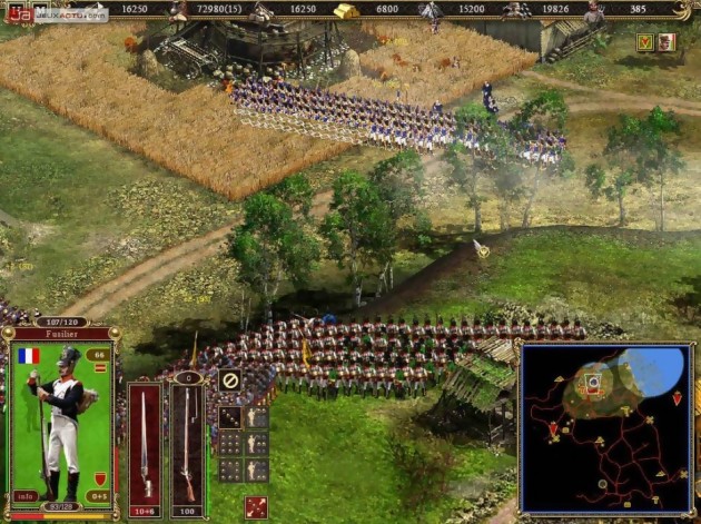Contrairement à son prédécesseur, Cossacks II limite au strict minimum les phases de gestion au profit de la stratégie pure et dure. En effet, si vos paysans construisent encore quelques bâtiments et collectent des ressources (essentiellement le bois et la pierre), on dispose souvent de tous les édifices nécessaires à l’effort de guerre et de quelques centaines d’unités prêtes à partir au combat. Quant aux autres ressources (charbon, fer, nourriture et or), il faudra asservir la population des villages aux alentours pour vous ravitailler fréquemment. Une option bien pratique lorsqu’il s’agit de diriger plusieurs milliers d’unités à l’écran. Si le titre est capable d’une telle prouesse, il est en contrepartie très gourmand en ressources et il faudra nécessairement avoir une bonne configuration pour le faire tourner de manière correcte. Concernant les batailles, les plus fins stratèges seront véritablement aux anges. En effet, l’issue de la bataille est toujours incertaine dans la mesure où elle dépend de nombreux facteurs : le type d’unité employé, leur fatigue, leur portée et leur moral, mais cela varie aussi en fonction de votre timing, de l’environnement et la formation utilisée. Par exemple, couvrir vos troupes dans une forêt les protégera de la plupart des balles ennemies, les marécages ralentissent les déplacements, les canons auront une portée de tir accrue en prenant de la hauteur, etc, etc. Ainsi, une armée inférieure en nombre à une autre peut finalement en venir à bout avec des pertes minimes. On n’a donc pas l’impression que la victoire est déterminée par le simple jeu d’une équation mathématique.