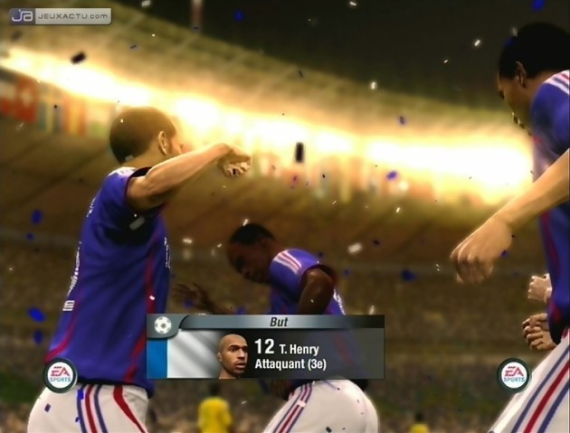 Si sur le plan du gameplay, Coupe du Monde de la FIFA 2006 est bien mal en point, l’esthétisme du jeu lui permet de sortir la tête de l’eau. Excellent en décembre dernier, le moteur graphique réutilisé pour l’occasion n’a pas perdu de sa superbe. La modélisation des footballeurs est tout aussi crédible malgré un aspect poupée de cire (trop ?) habituel aux productions Xbox 360. Bien évidemment, on peut toujours chipoter et remarquer que, malgré l’achat de la licence, certains joueurs ne bénéficient pas du même rendu. Dès lors qu’ils ne font pas partie de la scène internationale, ils font office d’inconnus aux yeux d’EA Canada. Et oui Dhorasso ! Il va falloir améliorer ton jeu pour espérer un jour être modélisé dans les moindres détails par Electronic Arts. A contrario, la motion capture ne laisse personne sur le banc des remplaçants. Tous les gestes et attitudes d’un footballeur y sont scrupuleusement détaillés. De la position de frappe aux plongeons d’un gardien en passant par les gestes techniques ou les fautes d’anti-jeu, on a vraiment l’impression d’assister à un vrai match. Seule la vitesse de jeu nous met la puce à l’oreille tant les 22 acteurs d’une rencontre font preuve d’une rapidité surhumaine même balle aux pieds. Et puis si on cherche la petite bête, lorsque l’on admire un but au ralenti, on s’aperçoit que le buteur touche rarement la balle. C’est seulement grâce à un bug ou à un espace entre le ballon et sa jambe que le but est inscrit. Un petit détail de rien du tout mais qui agacera les puristes. Enfin, la dernière critique que l’on peut faire à l’encontre d’Electronic Arts, c’est qu’en sortant son jeu bien avant l’évènement, les effectifs des équipes internationales ne sont pas à jour. Coupet à la place de Barthez dans le camp français, Robert Pires ou Ludovic Giuly sélectionnés ou des blessés miraculeusement guéris, voilà quelques exemples qui nous prouvent qu’Electronic Arts ferait un très mauvais sélectionneur. N’est pas Raymond Domenech qui veut !