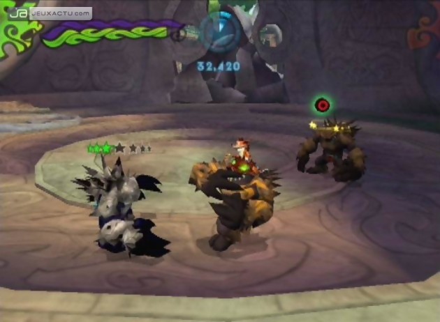 Le Professeur Neo Cortex a encore frappé. Alors que Crash et toute sa bande se prélassent en respirant l'air frais des montagnes, le docteur machiavélique fait irruption et kidnappe Coco, la frangine de notre héros au poil orangé. Comme une mauvaise nouvelle n'arrive jamais seule, Neo Cortex a érigé toute une armée de mutants en menant secrètement des expériences scientifiques sur les animaux de l'île Wumpa. Encore une fois, Crash va devoir déjouer les plans de son ennemi juré pour sauver sa soeur, et rétablir la paix sur ce coin de paradis. Crash of The Titans conserve le même esprit qui animait ses prédécesseurs, avec cet humour savamment dosé ne versant jamais dans l'excès. Radical Entertainment multiplie d’ailleurs les situations loufoques par le biais de cut scenes bien hilarantes, il faut le reconnaître. Coté gameplay, on retrouve tous les coups originaux de Crash, plus quelques gifles que peut désormais distribuer le bandicoot via un système de combos basique, mais efficace. La gamme des mandales que l'on distribue s'étoffe au fur et à mesure que la jauge Mojo se remplit. Mais la nouveauté la plus notable demeure la possibilité de prendre le contrôle des fameux titans conçus par Neo Cortex, après avoir récupéré le masque Aku-Aku. Il suffit alors de stunner le colosse grâce à un enchaînement de coups bien placé, puis de grimper sur sa tête en pressant B ; on accède alors à une nouvelle panoplie de coups, dont une attaque spéciale en appuyant sur A. Les développeurs ont profité de l'occasion pour tisser des énigmes destinées à exploiter les compétences de chaque titan dompté. Défoncer une porte, atteindre une cible éloignée, franchir une mare de lave, voilà quelques-unes des missions à accomplir en sélectionnant le monstre approprié parmi la quinzaine disponible. Pour apporter de la subtilité dans la manoeuvre, on sera par moments contraint de chevaucher un titan avant de pouvoir en assommer un autre, cette pratique s’appliquant notamment au moment d’affronter un boss.