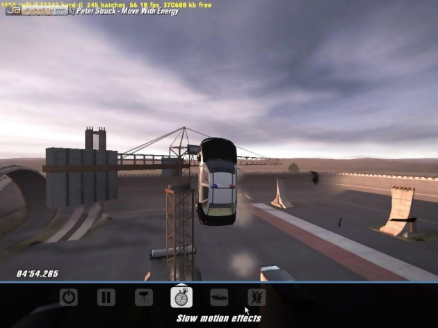 Bien que les voitures réagissent tout le temps de la même façon, les épreuves, donc les circuits, ont tout de même une grande influence sur ce qui se passe à l’écran. Si les courses traditionnelles ne permettent pas de grandes fantaisies, dès qu’il s’agit de cascades, ça devient du grand n’importe quoi, pour notre plus grand plaisir. Le joueur devra faire preuve d’une grande polyvalence et c’est un peu ce que l’on peut reprocher au jeu. Contrairement à Toca, le joueur n’a pas le choix des épreuves pour passer au chapitre suivant. Il doit absolument réussir 3 ou 4 compétitions beaucoup trop différentes. Peut-être aurait-il été plus judicieux de créer deux championnats, le premier concernant les courses et le deuxième le reste. Quel mutant peut être aussi à l’aise dans une course façon Burnout que dans des épreuves plus proches du jeu de plate-forme ou d’action ? Si l’aficionado de la deuxième catégorie en demande encore, il se réjouira au fur et à mesure de ses réussites d’ouvrir des minis jeux. Bon, rien de bien novateur là-dedans. C’est d’ailleurs à ce moment-là, avec ces niveaux supplémentaires, que l’on percute : on se retrouve devant un clone total de FlatOut : sauts en longueur, passage de la voiture dans des cadres… Mais va-t-on vraiment se plaindre ? Ce titre est également très bien réalisé et permet de nous faire patienter jusqu’à la sortie de FlatOut 2…
