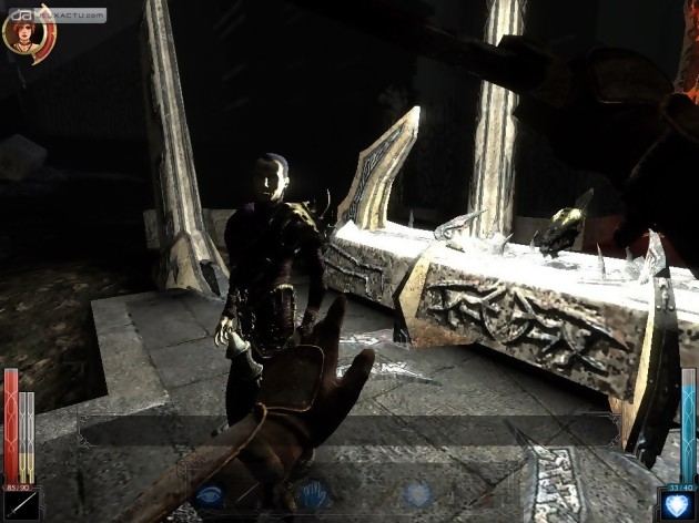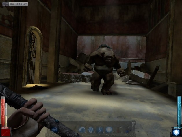 Prophétie et fin des temps sont au rendez-vous de ce Dark Messiah of Might & Magic dont le scénario ne manque toutefois pas d’un brin de finesse retorse. Grands amateurs d’heroïc-fantasy devant l’éternel, les développeurs lyonnais, s’ils n’évitent pas bien des lieux communs, parviennent à préserver la dimension épique d’une aventure remarquable. Les premières minutes de jeu, qui vous voient, disciple d’un maître magicien, vagabonder dans un donjon à la recherche d’un mystérieux cristal, se posent là question ambiance. Pierres suintantes, ossements épars, décor écrasants, chez Arkane Studios, on s’y connaît en souterrains poisseux. Les dix niveaux du jeu confirment cette bonne impression, vous baladant dans des lieux à la fois exotiques et malsains, déshumanisés et mal fréquentés. Car Dark Messiah of Might & Magic est avant tout une boucherie, à la première personne qui plus est, un chouette carnage qui laisse des traces de sang sur des murs dévorés par la mousse. Orcs et gobelins, nécromanciens et dragons, cyclopes et autres abominations dressent leurs armes ébréchées et leurs pattes poilues entre vous et l’artefact légendaire que vous convoitez. Un FPS donc… mais pas seulement.