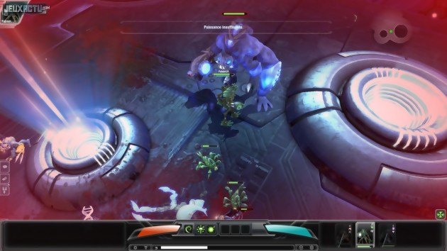 Le genre action-RPG, également appelé hack 'n' slash en raison de sa tendance à nous faire décimer du monstre à la chaîne, possède quelques très beaux représentants. L'incontournable Diablo bien sûr, mais également le récent Torchlight. C'est à ce dernier que Darkspore fait penser dans un premier temps, en raison de graphismes très cartoon. Il faut dire que le jeu reprend à son compte les créatures aussi monstrueuses que mignonnes du surestimé Spore. Il y en a une centaine à débloquer (en vérité 25 types de base, chacun d'entre eux étant décliné en quatre variations) et à personnaliser. Sur ce point précis, Darkspore commence déjà à souffler le chaud et le froid. Si l'on apprécie de pouvoir ramasser un grand nombre d'améliorations génétiques sur les champs de bataille, et de pouvoir les placer un peu comme bon nous semble sur nos héros, on regrette que l'éditeur de créatures de Spore ait été autant bridé. Il est en effet impossible de partir de zéro et de créer sa propre bestiole. On peut toujours se consoler en se disant qu'avec des créatures générées à l'avance, le jeu se montre très accessible. Peut-être même un peu trop puisque les premiers niveaux ne proposent absolument aucun challenge. Avancer et cliquer sur les monstres pour déclencher l'attaque de base suffit généralement à sortir vainqueur. Il faut attendre que les premières hordes de monstres débarquent pour utiliser les pouvoirs spéciaux (réunis dans une classique barre de "sorts" horizontale), et seuls les premiers boss nous demanderont de jongler entre nos différentes créatures. En effet, chaque niveau se parcoure avec une escouade de trois créatures à sélectionner parmi celles que l'on a déjà débloquées. On n'en contrôle qu'une à la fois, mais on peut zapper à tout moment de l'une à l'autre. L'intérêt ? Bénéficier de talents variés et pouvoir changer de combattant lorsqu'un adversaire de même type se présente face à lui. Car les créatures sont réparties en cinq types (Bio, Cyber, Necro, Plasma, Quantum) et un ennemi inflige systématiquement et automatiquement deux fois plus de dégâts à une créature du même type que lui. Un paramètre qu'on peut négliger dans les premiers niveaux, mais qu'il faut impérativement prendre en compte plus tard.