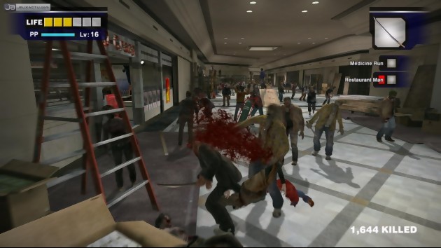Si Dead Rising emprunte quelques ingrédients à GTA, le jeu lorgne davantage vers le beat’em all massif, comparable à un Dynasty Warriors, et le nombre de morts-vivants n’a pas à rougir face au titre signé KOEI puisque le surclasse haut la main. La Xbox 360 sort ses tripes pour nous afficher à l’écran une quantité de personnages qui dépasse parfois l’entendement, surtout lorsqu’on se déplace en véhicule et que le système de pop-ups a été intégré au jeu de manière très subtil. . Un nombre qui ne fait que croître en fonction de l’avancée dans le jeu. Heureusement, Franck dispose d’un arsenal plutôt conséquent pour se débarrasser de ces zombies et n’hésitera d’ailleurs pas à utiliser tout ce qui lui passe entre les mains pour se frayer un chemin. Poubelle, chaise, banc, batte de base-ball, pot de fleurs, les premiers objets qu’il utilisera au début restent très classiques. Il faudra jouer quelques heures et fouiller dans les moindres recoins avant de passer à la catégorie supérieure, celle qui permet de faire grimper notre sentiment de puissance d’un cran. Tondeuse à gazon, faucille, marteau, hache de pompier, katana, épée, tronçonneuse, fusil à pompe, uzi, machette, il y a de quoi faire de gros bobos chez nos amis les zombies. Ca tombe bien, ils sont de nature assez fragiles et il ne sera donc pas rare de leur arracher un bras, une jambe ou, mieux encore, une tête.