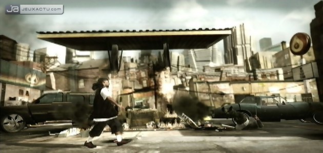 Vous l’aurez donc compris le mode "Monter un Label" mise avant tout sur les combats. Et là on approche du point sensible de Def Jam : Icon. Comme stipulé durant la campagne promotionnelle du jeu, Electronic Arts a joué gros sur le mélange baston de rue et musiques. Le résultat est aussi étrange qu’intéressant puisque les décors dans lesquels vous évoluerez bougent au rythme des basses de chaque morceau, différent d’un artiste à un autre. Par conséquent, les éléments présents dans l’arène se déforment petit à petit, se brisent au son des basses, explosent ici ou là. Cette interaction n’est pas là que pour nous émerveiller la rétine mais elle représente un véritable danger de tous les instants pour quiconque se retrouve balancer contre une pompe à essence, une bagnole, un hélicoptère, une gogo danseuse ou une cheminée. Danger pour l’un mais allier pour l’autre. Vous devrez donc tendre l’oreille afin d’attaquer au rythme de la musique et faire un maximum de dégâts. Mais si vous êtes du genre impatient, vous pouvez également différer le beat grâce aux platines DJ associées aux sticks analogiques gauche et droite. Le premier permet, en maintenant LT ou L2, de passer le morceau associé à votre rappeur. Ce changement de son permet à son combattant de booster la puissance et la rapidité de ses attaques. L’autre stick scratche la musique afin de déclencher simultanément les objets interactifs du décor. Une fois ces deux paramètres bien intégrés, il ne vous reste plus qu’à réduire en charpie votre adversaire.