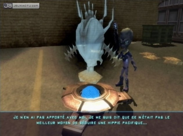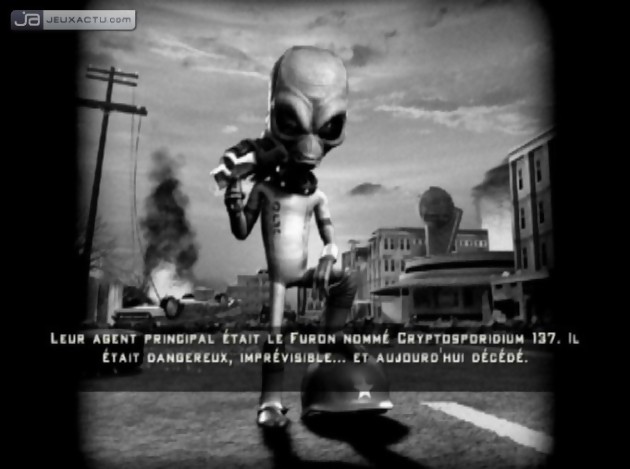 Il s’en est passé du temps entre le moment où Crypto 138 s’amusait à devenir le premier proctologue extraterrestre et son nouveau rôle de Président des Etats-Unis d’Amérique. Il s’est écoulé précisément dix ans. Les années guillerettes d’après-guerre font place donc à une nouvelle ère où la liberté sexuelle côtoie les plantations de cannabis et les récoltes de champignons. Mais les sixties, ce n’est pas que le dévergondage de la population. C’est aussi, pour ceux qui ont ouvert une fois dans leur vie un bouquin d’histoire, la Guerre Froide et les tensions entre USA et URSS. Crypto, dans son rôle de président, a préféré badiner avec l’amour plutôt que de calmer les ardeurs soviétiques. S’il a réussi à se glisser au plus haut poste des responsabilités américaines en dissimulant sa véritable identité, le KGB l’a démasqué. Et après une tentative d’assassinat raté, notre petit alien est déchu de son poste et devra reconstruire de ses propres mains le vaisseau amiral furon en suivant scrupuleusement les ordres de son chef Orthopox réduit en hologramme après avoir déguster quelques missiles soviétiques pendant sa balade dominicale spatiale. Le ton est donc donné avec Destroy All Humans ! 2. Vous devrez déjouer les plans russes sur fond de musique hippie et à la manière du premier opus, le jeu de THQ regorge de clins d’œil aux films des années 1960 qui faisaient la part aux invasions extraterrestres mais aussi aux films d’espionnages et aux premiers pas nippons de Godzilla. Cette fois-ci, vous allez en voir du pays des villes branchouilles des Etats-Unis, à l’Angleterre pluvieuse en passant par le Japon ou l’Union Soviétique. Et par conséquent, tous les clichés sont au rendez-vous pour donner à Destroy All Humans ! 2 une pointe d’humour appréciable doublée par des dialogues hauts en couleurs.