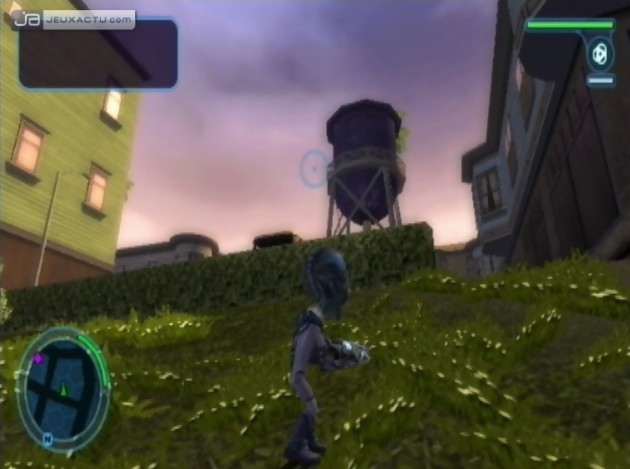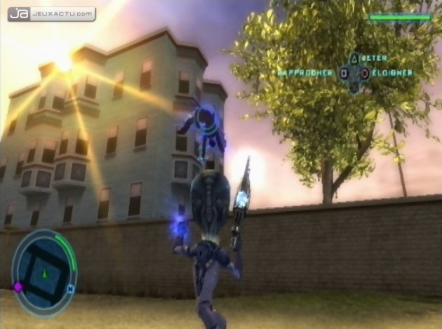 Mais c’est surtout via la panoplie d’armes et de pouvoirs psychiques que Crypto s’amuse à plagier certains long-métrages. Comme pour Destroy All Humans !, notre héros possède son fameux Zap-O-Matic qui fait frire les humains grâce à une onde de choc électrique ou sa sonde anale indécrottablement placée là où le soleil de brille pas ou très rarement dans certains cas. A côté de ça, on retrouve une nouvelle arme : le Dislocateur qui balance une sphère acérée promenant de droite à gauche l’objet ou le corps dans lequel elle s’est plantée. Vous en voulez plus ? Alors, vous pourrez opter pour le Rayon Désintégrateur dont le principe n’est pas à expliquer ou le Détonateurs à Ions sorte de grosse bombe plasmatique détruisant tout sur son passage. Mais Crypto est aussi agile de ses mi-mines qu’il l’est avec son cerveau d’hydrocéphale. Comme toujours, il peut se camoufler en humains grâce à la fonction Marionnette qui lui permet de se glisser dans la peau de ses victimes afin de passer inaperçu aux yeux de tous. Mais lorsque vous êtes surpris en train de prendre possession d’un nouveau corps, il vous est possible d’effacer la mémoire des témoins en les obligeant à danser frénétiquement grâce à l’Amour Libre. C’est l’une des seules possibilités lorsque vous êtes sous forme humaine. Impossible d’utiliser vos armes, ni de bouger les objets par le pouvoir de télékinésie et le moindre coup de fusil vous fait réapparaître dans votre état original d’alien. En effet, toutes les actions que vous réaliserez auront pour conséquence d’alerter la population et donc les forces de l’ordre qui seront toujours plus nombreuses à vos trousses si vous ne parvenez pas à calmer le jeu en vous camouflant à pied ou en soucoupe volante. L’OVNI est une nouvelle fois de la partie dans Destroy All Humans ! 2 mais les séquences de jeu aériennes manquent de dynamisme à la manière du premier volet.