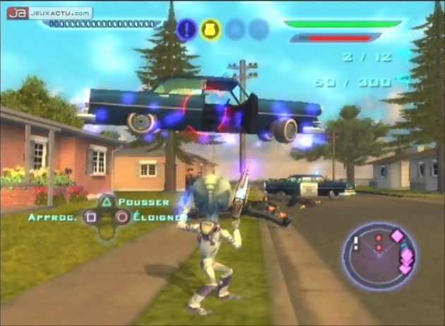C’est dans une Amérique très sixties que Destroy All Humans va vous demander de trouver, torturer et annihiler la race humaine. Fortement inspiré des premiers films en noir et blanc évoquant une invasion extraterrestre, le jeu s’amuse à en ressortir tous les clichés, et c’est sous une musique volontairement kitsch et des dialogues délirants sortis d’un autre temps que l’action prend forme. Après l’incontournable atterrissage dans les champs de blé et la toute aussi classique rencontre avec nos bonnes vieilles vaches fermières, vous allez vite rencontrer les premiers spécimens à deux pattes pour essayer vos pouvoirs et tester votre attirail. Lecture mentale, télékinésie, rayon zappant, sonde anale (oui oui, vous avez bien lu), vous allez même pouvoir prendre le contrôle de votre soucoupe pour kidnapper ou carboniser tout ce qui traîne. Le jeu alterne alors phases à pieds ou vous devrez faire exploser la tête des humains pour récupérer leur ADN en ramassant leur cerveau (ok, y’a moins violent, mais vous êtes un extraterrestre belliqueux après tout, et de toute façon vous n’avez pas de cotons-tiges à leur coller dans la bouche pour le prélèvement), et phases de vol ou la plupart du temps vous devrez pulvériser tout ce qui se trouve au sol en évitant les attaques militaires. Pancartes, voitures, maisons, animaux et terriens, les décors sont en grande partie destructibles, et rien que pour assouvir nos pulsions destructrices on s’amuse à incendier les domiciles, exploser les voitures en série et terroriser les américains des années 60. Comme dans Psy Ops , qui avait lancé ce qui semble être devenu désormais à la mode dans les jeux vidéo, le plus jouissif reste la télékinésie. En effet quelle sensation de puissance que de soulever hommes et femmes pour les projeter dans les airs, ou d’écraser ces mêmes personnes sous la masse d’une voiture sous votre contrôle psychique.