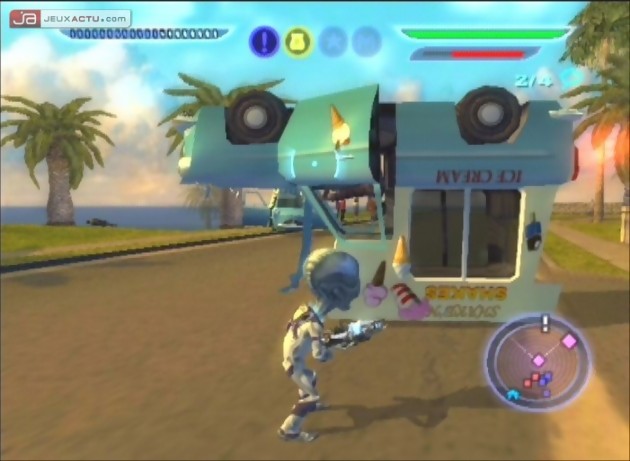 Mais ne vous y trompez pas, si le titre du jeu indique clairement les intentions de nos aliens, il faudra aussi jouer de finesse pour prendre le contrôle de cette nouvelle réserve d’ADN. Pour éviter les assauts incessants des forces de police et militaires, vous pourrez alors prendre apparence humaine pour mieux approcher la foule, vous faire passer pour le maire pour effectuer un discours à sa place et couvrir vos actions ou encore hypnotiser vos cibles pour gagner du temps. L’apparence humaine consommant votre énergie, vous devrez puiser dans les cerveaux terriens assez de concentration pour ne pas redevenir aux yeux de tous le petit être gris ignoble que vous êtes. Pour se faire, il vous faudra lire les pensées des nombreux citoyens peuplant votre zone d’atterrissage, l’occasion de découvrir les dialogues délirants de cette Amérique profonde très rurale, et la vision que ses habitants ont de leur futur. Avec des objectifs variés sur la forme, chaque niveau vous placera dans une ville imposante où, une fois votre mission effectuée, vous pourrez à loisir vadrouiller pour semer le chaos ou réaliser des objectifs secondaires vous donnant des points supplémentaires pour acheter différentes améliorations. Votre rayon électrique aura alors une zone d’action plus large, vous pourrez soulever des objets plus lourds avec votre télékinésie (comme des voitures), ou rendre vos armes plus puissantes.