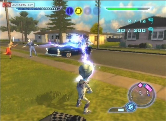 C’est dans une Amérique très sixties que Destroy All Humans va vous demander de trouver, torturer et annihiler la race humaine. Fortement inspiré des premiers films en noir et blanc évoquant une invasion extraterrestre, le jeu s’amuse à en ressortir tous les clichés, et c’est sous une musique volontairement kitsch et des dialogues délirants sortis d’un autre temps que l’action prend forme. Après l’incontournable atterrissage dans les champs de blé et la toute aussi classique rencontre avec nos bonnes vieilles vaches fermières, vous allez vite rencontrer les premiers spécimens à deux pattes pour essayer vos pouvoirs et tester votre attirail. Lecture mentale, télékinésie, rayon zappant, sonde anale (oui oui, vous avez bien lu), vous allez même pouvoir prendre le contrôle de votre soucoupe pour kidnapper ou carboniser tout ce qui traîne. Le jeu alterne alors phases à pieds ou vous devrez faire exploser la tête des humains pour récupérer leur ADN en ramassant leur cerveau (ok, y’a moins violent, mais vous êtes un extraterrestre belliqueux après tout, et de toute façon vous n’avez pas de cotons-tiges à leur coller dans la bouche pour le prélèvement), et phases de vol ou la plupart du temps vous devrez pulvériser tout ce qui se trouve au sol en évitant les attaques militaires. Pancartes, voitures, maisons, animaux et terriens, les décors sont en grande partie destructibles, et rien que pour assouvir nos pulsions destructrices on s’amuse à incendier les domiciles, exploser les voitures en série et terroriser les américains des années 60. Comme dans Psy Ops , qui avait lancé ce qui semble être devenu désormais à la mode dans les jeux vidéo, le plus jouissif reste la télékinésie. En effet quelle sensation de puissance que de soulever hommes et femmes pour les projeter dans les airs, ou d’écraser ces mêmes personnes sous la masse d’une voiture sous votre contrôle psychique.