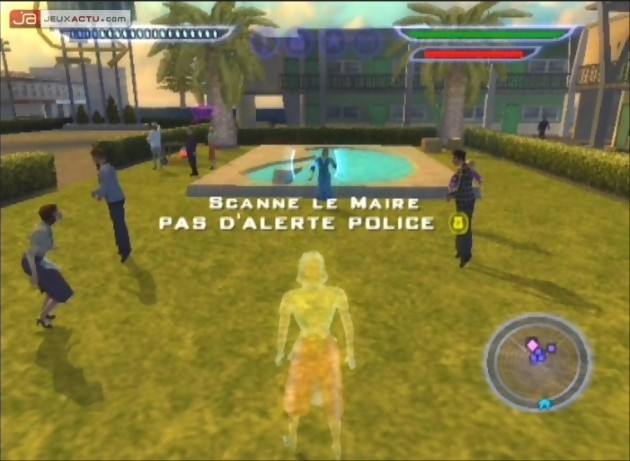Mais ne vous y trompez pas, si le titre du jeu indique clairement les intentions de nos aliens, il faudra aussi jouer de finesse pour prendre le contrôle de cette nouvelle réserve d’ADN. Pour éviter les assauts incessants des forces de police et militaires, vous pourrez alors prendre apparence humaine pour mieux approcher la foule, vous faire passer pour le maire pour effectuer un discours à sa place et couvrir vos actions ou encore hypnotiser vos cibles pour gagner du temps. L’apparence humaine consommant votre énergie, vous devrez puiser dans les cerveaux terriens assez de concentration pour ne pas redevenir aux yeux de tous le petit être gris ignoble que vous êtes. Pour se faire, il vous faudra lire les pensées des nombreux citoyens peuplant votre zone d’atterrissage, l’occasion de découvrir les dialogues délirants de cette Amérique profonde très rurale, et la vision que ses habitants ont de leur futur. Avec des objectifs variés sur la forme, chaque niveau vous placera dans une ville imposante où, une fois votre mission effectuée, vous pourrez à loisir vadrouiller pour semer le chaos ou réaliser des objectifs secondaires vous donnant des points supplémentaires pour acheter différentes améliorations. Votre rayon électrique aura alors une zone d’action plus large, vous pourrez soulever des objets plus lourds avec votre télékinésie (comme des voitures), ou rendre vos armes plus puissantes.