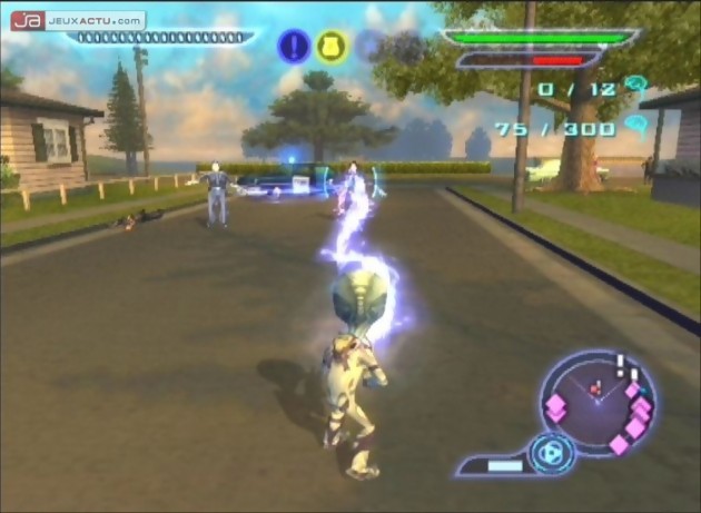 C’est dans une Amérique très sixties que Destroy All Humans va vous demander de trouver, torturer et annihiler la race humaine. Fortement inspiré des premiers films en noir et blanc évoquant une invasion extraterrestre, le jeu s’amuse à en ressortir tous les clichés, et c’est sous une musique volontairement kitsch et des dialogues délirants sortis d’un autre temps que l’action prend forme. Après l’incontournable atterrissage dans les champs de blé et la toute aussi classique rencontre avec nos bonnes vieilles vaches fermières, vous allez vite rencontrer les premiers spécimens à deux pattes pour essayer vos pouvoirs et tester votre attirail. Lecture mentale, télékinésie, rayon zappant, sonde anale (oui oui, vous avez bien lu), vous allez même pouvoir prendre le contrôle de votre soucoupe pour kidnapper ou carboniser tout ce qui traîne. Le jeu alterne alors phases à pieds ou vous devrez faire exploser la tête des humains pour récupérer leur ADN en ramassant leur cerveau (ok, y’a moins violent, mais vous êtes un extraterrestre belliqueux après tout, et de toute façon vous n’avez pas de cotons-tiges à leur coller dans la bouche pour le prélèvement), et phases de vol ou la plupart du temps vous devrez pulvériser tout ce qui se trouve au sol en évitant les attaques militaires. Pancartes, voitures, maisons, animaux et terriens, les décors sont en grande partie destructibles, et rien que pour assouvir nos pulsions destructrices on s’amuse à incendier les domiciles, exploser les voitures en série et terroriser les américains des années 60. Comme dans Psy Ops , qui avait lancé ce qui semble être devenu désormais à la mode dans les jeux vidéo, le plus jouissif reste la télékinésie. En effet quelle sensation de puissance que de soulever hommes et femmes pour les projeter dans les airs, ou d’écraser ces mêmes personnes sous la masse d’une voiture sous votre contrôle psychique.