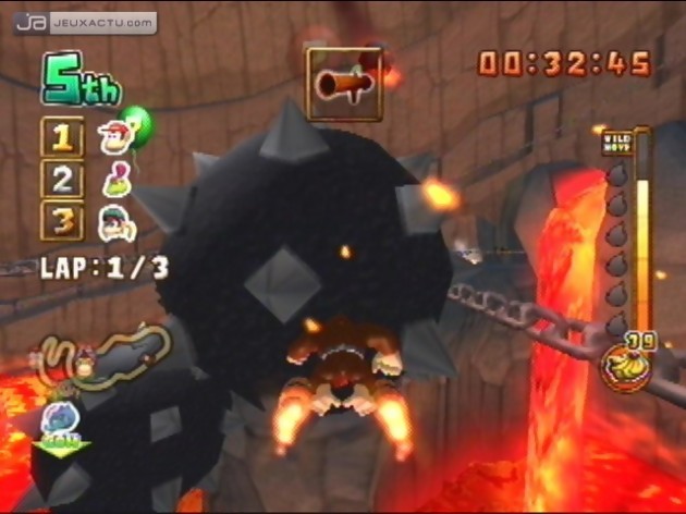 Dispatchés sur le circuit comme des miettes de pain, les barils peuvent être fracassés par une simple pression sur A. On peut aussi sauter par-dessus en levant les poignets, mais cela nécessite un bon timing quand ils sont rapprochés. Sur la piste, on peut également squatter les tonneaux bonus qui permettent soit d'emprunter un raccourci du circuit - mention spéciale pour le bobsleigh -, soit d'emmagasiner un max de bananes pour gonfler sa barre de boost. Il faut alors réaliser une série de tricks dans les airs en veillant à bien respecter la direction indiquée par les pictogrammes qui s'enchaînent à l'écran. Au niveau des items, Donkey Kong Jet Race s'inspire naturellement du bestiaire du royaume Donkey Kong, en y intégrant quelques armes fantaisistes histoire de présenter une collection crédible. On retrouve ainsi les Zingers, ces abeilles qui viennent vous bouffer la peau; pour s'en débarrasser il faut secouer vigoureusement la Wiimote et le Nunchuk dans tous les sens. Il y aussi les bananes enflammées qui font perdre pas mal de temps si l'on glisse dessus. N'oublions pas non plus Enguarde, l'espadon qui offre un pilotage automatique le temps de quelques secondes. Le bazooka, quant à lui, se la joue carapace rouge puisqu'il track l'ennemi le plus proche. A vrai dire, il ne faut pas compter sur les objets pour animer les courses et tenter d'invraisemblables retournements de situation. C'est sans doute là que réside le problème de Donkey Kong Jet Race, à savoir ne pas proposer des courses dynamiques qui tiennent en haleine jusqu'à la ligne d'arrivée. A la limite, on regrette parfois l'absence d'abus d'I.A. bien gras qui font postillonner sur l'écran. Les bonus et autres gimmicks sont trop nombreux sur les pistes pour laisser parler le talent pur des pilotes. C'est vrai qu'il est toujours possible de réaliser des petites esquives à coup de poignet bien placé, mais dans l'ensemble ça roupille sec. Même dans les catégories supérieures où les adversaires se font un peu plus coriaces, c'est pas bien difficile de jouer au chef. Ok, il y aura toujours une ou deux racailles pour empêcher d'engranger systématiquement le maximum de points. Mais contrairement à un Mario Kart, ils ne remportent pas obligatoirement la course si on ne termine pas sur la première marche du podium. Pour une fois, le contraire n'aurait pas dérangé.