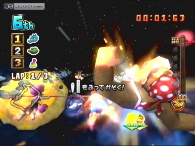 Difficile en effet de ne pas penser à Mario Kart lorsque l'on voit Donkey Kong tenter de rassembler tous ses potes autour de pseudo-landspeeders lancés à grande vitesse. C'est d'ailleurs pour noyer le poisson dans l'eau que Donkey Kong Jet Race adopte un habillage proche de celui de Donkey Konga, avec des menus lustrés à la cire d'abeille et des backgrounds à base de palmiers et de noix de coco. Des proches de la famille tels que Cranky Kong ou bien encore Candy Kong se glissent même dans le costume de guide de service pour faciliter la navigation. Concernant la réalisation, Donkey Kong Jet Race ne casse pas des briques et se contente du strict minimum syndical pour une console next gen', YUV activé ou pas. Aucun circuit ne parvient à claquer la rétine, si ce n'est certains secteurs mieux réussis que d'autres, comme la jungle et ses bananiers qui filtrent les rayons de soleil, ou bien les montagnes enneigées et leurs flocons. Quelques séquences au bord de la mer ou dans le désert de l'Egypte pharaonique sont aussi sympathiques, mais il est évident que les paysages souffrent d'un vide assez hallucinant. Pour mieux faire passer la pilule, le framerate ne connaît aucune baisse de régime, même si ce n'est pas du WipeOut en matière de vitesse de pointe. L'affichage respecte les standards des jeux de course : la position actuelle du joueur, celle des concurrents, la map du circuit, les items récupérés et le chronomètre. A droite de l'écran se trouve la barre de boost. Chaque banane récoltée permet de la gonfler, ce qui n'augmente pas la vitesse de pointe mais fournit des turbos que l'on peut utiliser en pressant le stick vers le bas. Donkey Kong Jet Race la joue même subtil puisqu'un système de combos à été mis en place. Explications : à chaque fois que l'on pulvérise un baril en plein turbo, on bénéficie d'une nitro supplémentaire qui est consommée immédiatement. En gros, il est possible, avec un turbo, de parcourir plusieurs mètres à grande vitesse pour peu que l'on vise correctement les tonneaux. Pas de rétro à se mettre sous la dent, juste des avatars qui apparaissent en transparence en bas de l'écran pour signaler la proximité d'un adversaire. C'est propre, mais ultra-basique.