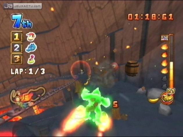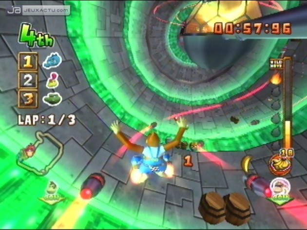 Difficile en effet de ne pas penser à Mario Kart lorsque l'on voit Donkey Kong tenter de rassembler tous ses potes autour de pseudo-landspeeders lancés à grande vitesse. C'est d'ailleurs pour noyer le poisson dans l'eau que Donkey Kong Jet Race adopte un habillage proche de celui de Donkey Konga, avec des menus lustrés à la cire d'abeille et des backgrounds à base de palmiers et de noix de coco. Des proches de la famille tels que Cranky Kong ou bien encore Candy Kong se glissent même dans le costume de guide de service pour faciliter la navigation. Concernant la réalisation, Donkey Kong Jet Race ne casse pas des briques et se contente du strict minimum syndical pour une console next gen', YUV activé ou pas. Aucun circuit ne parvient à claquer la rétine, si ce n'est certains secteurs mieux réussis que d'autres, comme la jungle et ses bananiers qui filtrent les rayons de soleil, ou bien les montagnes enneigées et leurs flocons. Quelques séquences au bord de la mer ou dans le désert de l'Egypte pharaonique sont aussi sympathiques, mais il est évident que les paysages souffrent d'un vide assez hallucinant. Pour mieux faire passer la pilule, le framerate ne connaît aucune baisse de régime, même si ce n'est pas du WipeOut en matière de vitesse de pointe. L'affichage respecte les standards des jeux de course : la position actuelle du joueur, celle des concurrents, la map du circuit, les items récupérés et le chronomètre. A droite de l'écran se trouve la barre de boost. Chaque banane récoltée permet de la gonfler, ce qui n'augmente pas la vitesse de pointe mais fournit des turbos que l'on peut utiliser en pressant le stick vers le bas. Donkey Kong Jet Race la joue même subtil puisqu'un système de combos à été mis en place. Explications : à chaque fois que l'on pulvérise un baril en plein turbo, on bénéficie d'une nitro supplémentaire qui est consommée immédiatement. En gros, il est possible, avec un turbo, de parcourir plusieurs mètres à grande vitesse pour peu que l'on vise correctement les tonneaux. Pas de rétro à se mettre sous la dent, juste des avatars qui apparaissent en transparence en bas de l'écran pour signaler la proximité d'un adversaire. C'est propre, mais ultra-basique.