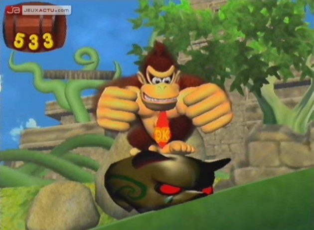 Mais qui donc est la vraie star chez Nintendo ? Mario ? Luigi ? Link ? Yoshi ? Eh bien, à y regarder de plus près, le grand bonhomme chez Nintendo ces derniers temps n’est autre que Donkey Kong, l’ennemi intime de Mario, bien avant que Bowser ne sorte de l’ombre. Héros à part entière, depuis un certain Donkey Kong Country sur Super Nintendo, Donkey était depuis catalogué au rang de "méchant" sur les différents titres multijoueur tels que Mario Kart, Mario Tennis ou encore Mario Golf. Depuis la sortie de Donkey Konga, il y a quelques mois sur GameCube, le grand singe est de nouveau en grâce et revient à ses premiers amours, la plate-forme.