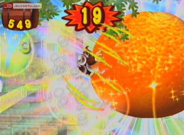 Techniquement, c’est plutôt sympa, ni franchement beau ni désagréable, c’est du GameCube et c’est du Nintendo, donc rien à reprocher. Quelques effets de lumière ici ou là, des passages tout en couleurs et d’autres plus sombres, une fluidité exemplaire, bref, un travail soigné. Côté bande son, on retrouve l’ambiance d’un Donkey Konga, mais étant donné que l’on passe la plupart de son temps à taper dans ses mains ou sur les bongos, on ne pense pas forcément à écouter ce qui sort des enceintes. D’autant que Donkey crie très très fort (parfois trop) et à tendance à couvrir la musique d’ambiance.