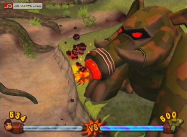 Conscients de leurs difficultés face à la concurrence de Sony et Microsoft, Nintendo ne mise plus du tout sur un rapport de force/puissance mais tente la carte de la différence et de l’originalité. La preuve avec la DS, la Revolution (la prochaine console de salon de Nintendo) et dans une moindre mesure avec Donkey Konga et donc avec Jungle Beat aujourd’hui. Car si le jeu reste néanmoins jouable à la manette, il ne présente alors absolument aucun intérêt. Jungle Beat est certes un jeu de plate-forme, mais qui se joue différemment de ce que l’on a l’habitude de voir. Bien que le héros et l’accessoire soient les mêmes, les bongos, Jungle Beat n’est pas un jeu musical supplémentaire ni un disc d’add-on pour Donkey Konga. Oubliez un instant le rapprochement entre les bongos et des tam-tam et considérez l’objet comme une manette de jeu. Un coup à droite et on avance vers la droite, un coup à gauche et on se déplace vers la gauche, une alternance droite-gauche ou gauche-droite et on saute dans la direction voulue, et enfin un simple claquement de mains pour frapper ses ennemis. Voici en moins de deux lignes le principe de Jungle Beat.