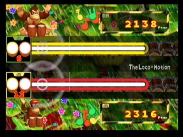 Sorti en novembre 1998 sur Playstation, Bust-A-Groove est sans doute celui qui a réussi l'une des plus belles percées en Occident, grâce à des graphismes colorés et des thèmes musicaux entraînants. Nous pourrions également citer Parappa The Rapper qui, un an plutôt, n'a pas tremblé au moment de franchir les frontières asiatiques pour se frotter aux exigences des sony-boys de l'Ouest. De son coté, la Sonic Team nous a gâtés avec son excellentissime Samba de Amigo et ses maracas taillés sur mesure pour la Dreamcast, tandis qu'aujourd'hui Konami ne compte même plus les temps auxquels est conjugué son mythique Dance Dance Revolution. Rythmés sur des soundtracks faits maison lorsqu'ils ont pointé le bout de leur nez sur la scène vidéoludique, ces musical games ont, par la suite, repris des morceaux connus dans le monde entier. Mieux encore, ils ont su remplacer les manettes par des accessoires qui permettent de réaliser de véritables chorégraphies dignes des danseuses de Kamel Ouali. Et pour les musiciens en herbe, les instruments factices ne manquent pas : guitares, batteries, platines vinyl... C'est donc dans un secteur déjà fourni que débarque Donkey Konga, un jeu que Shigeru Miyamoto apprécie certainement; lui qui n'a jamais caché son admiration pour Samba de Amigo et qui avait fait la promesse au Gamecube de lui offrir un jeu au concept similaire. Avec l'expérience de Namco, à qui l'on doit Taiko No Tatsujin sur Playstation 2, les kongas sont prêts à vibrer pour notre plus grand plaisir.