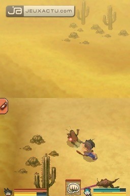 Bien que la croix directionnelle soit utilisée pour déplacer le jeune Goku, Dragon Ball : Origins est la preuve que le tout-stylet n’est pas nécessairement de bon aloi sur DS. Fortement inspirée de The Legend of Zelda : Phantom Hourglass, la prise en main de base se révèle ici imprécise. Combiné à l’importante panoplie de mouvements dont a droit notre héros, ce constat n’en est que plus renforcé. Entre l’impossibilité de switcher du mode mains nues au mode bâton magique lorsqu’on est en mouvement, et la très grande variété de tracés nécessaires à l’exécution des différentes attaques, il n’est pas rare que le personnage ne réagisse pas comme on le voudrait. Des petits tracas qui peuvent se révéler bien plus problématiques face aux boss. Principale source de challenge, ils requiert comme souvent d’un minimum de jugeote et de sens de l’observation afin d’être mis à mal, ce qui est plutôt une bonne chose. Ce qui l’est moins en revanche, c’est leur exotisme parfois prononcé qui tranche radicalement avec l’attention qui découle de toutes les cinématiques liant deux chapitres. Sans compter que la visibilité n’est pas un point fort du titre (la liaison entre les deux écrans n’étant pas assurée, on évolue en permanence avec une sorte “d’angle mort”) et vous comprendrez que les nombreuses libertés et erreurs de conception que se sont octroyées les développeurs nuisent à l’immersion, ainsi qu’à l’intérêt du titre. La partie baston n’améliore en rien le bilan de ce Dragon Ball : Origins puisqu’elle souffre des mêmes tares. Dommage, car hormis l’ambiance sonore, Game Republic avait plutôt bien fait les choses en offrant un système de jeu classique mais efficace, où la progression passe par la redistribution de points de talent et l’acquisition de bonus de santé et de Ki à dénicher dans les nombreux coffres qui se cachent dans les niveaux. La jauge de Ki est d’ailleurs assez importante puisqu’elle couve en fait l’endurance de Goku. La durée de vie y avait également mis du sien (notre compteur affiche un peu moins de neuf heures de jeu en ligne droite, sans compter les quelques game over) avec une bonne dizaine d’épisodes bonus ou la possibilité de collectionner et d’échanger des statuettes. Mais naturellement, cela n’empêche pas Dragon Ball : Origins d’être une petite déception.