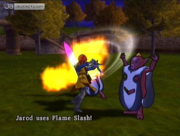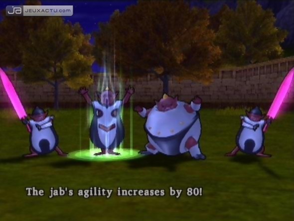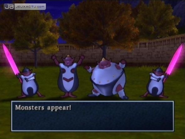 A noter que la première impression, les premières sorties dans ce vaste, vaste monde, peuvent être trompeuses. Alors oui, on tombe dès le premier donjon venu, puis dès le premier boss. Sauf que très vite, les sorts de soins arrivent, les MP pour puiser dedans sont de plus en plus conséquent, on peut s’enfuir d’un donjon d’un seul clic et faire de même pour se reposer à l’auberge la plus proche, la possibilité de ressusciter évite de retourner à l’église, et enfin vous finirez par vous battre avec une équipe de quatre personnages, dont nous ne manquerons pas de faire les présentations. Mais par dessus tout, le système de jeu de Dragon Quest est bien trop réservé pour que le jeu puisse être qualifié d’exagérément difficile. Outre l’équipement classique, les sorts et autres capacités spéciales s’acquièrent toutes automatiquement sans exception, au gré de votre montée en puissance. Il faut cependant noter qu’une grande partie de vos capacités personnelles dépendent de votre attribution des points de compétences. Chaque personnage manie en effet trois types d’armes, le combat à mains nues et enfin une capacité personnelle comme le sex appeal de Jessica pour charmer l’ennemi libidineux ou la capacité de provocation d’Angelo pour affaiblir l’opposant belliqueux. De par le faible nombre de points accordés, il faudra faire des choix si l’on veut obtenir les capacités les plus intéressantes d’une catégorie donnée. Ce côté aléatoire peut servir aussi bien que desservir selon telle ou telle situation. Mais en dehors de ces surprises de dernière minute, les sorts sont les mêmes pour tout le monde. Ainsi Angelo sera l’indubitable soigneur attitré, tandis que Jessica rendra service avec ses magies d’attaques massives et sa capacité à renforcer la puissance de vos deux grosbills que sont Yangus et Jarod. Enfin, je veux dire Yangus et "Heros", c’est à vous de le nommer selon votre bon vouloir. Tout cela pour en arriver à une conclusion très simple : il n’y a pas 36.000 tactiques à adopter dans Dragon Quest, de par son système de combat et d’évolution linéaire et ses rôles stricts bien définis entre votre unique quatuor de personnages. Même le système de renforcement, qui consiste à sacrifier un tour pour booster sa puissance par 5, 20, 50 voire 100, ne sera plus l’objet d’un dilemme face à des boss qui annulent tous ces attributs positifs en un éclair. Il en va de même lors des combats classiques, où la grande majorité du temps on se contente d’attaquer, d’attaquer, d’attaquer et d’attaquer sans rencontrer le moindre danger. Donc non seulement Dragon Quest : L'Odyssée du Roi Maudit n’est pas si ardu qu’on voulait bien le laisser croire, mais d’un certain côté on pourrait même le cataloguer comme trop limité dans son système de combat et d’évolution. Cette démonstration n’a aucunement pour but de créer une disparité entre ceux qui estiment le jeu trop difficile et les autres, il m’apparaît simplement trop stupide que des joueurs indécis passent à côté d’un tel chef-d’œuvre par peur de voir leur plaisir saccagé à cause d’une prétendue inaccessibilité. Clôturons donc ce chapitre qu’il fallait absolument prendre le temps d’éclaircir pour tout le monde. S’il ne se situe pas dans la famille des RPG sucrés et assistés, Dragon Quest est loin du logiciel d’auto-flagellation. Aucun sens de la stratégie n’est réellement requis, seulement beaucoup de temps et autant de patience.