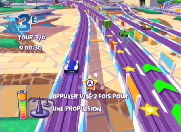 La version Wii ne fait guère mieux quant à elle, puisqu’elle se permet de proposer moins de défis que sa petite sœur sur DS ; et pour ce qui est de l’originalité et du fun, on a vu plus recherché. Le foufoot correspond ici à une sorte de tennis-ballon où chaque point est marqué en faisant trembler les filets de cages positionnées à chaque extrémité du terrain. Autant dire que cette version du foufoot est aussi conceptuelle qu’aléatoire, la faute à un partenaire un peu trop laxiste dans les buts. Le chat fléchettes, bien que facile, s’avère par contre sympathique, puisqu’il s’agit d’une version cour d’école de Ghost Squad et autre Resident Evil : The Umbrella Chronicles. Le pointeur servant non seulement à viser, mais également à se protéger via un bouclier qui apparaît en transparence et qu’il faut orienter, comme dans Dragon Quest Sword. Autre petite épreuve qui mérite un bref coup d’œil : le pilote en papier. Ici, il s’agira de tenir sa Wiimote comme on tiendrait un avion en papier pour contrôler divers engins volants, et récolter un maximum de points ou pour finir le parcours en un temps donné. Si l’usage fait de la Wiimote n’épatera plus grand monde, il faut tout de même avouer que les différents coucous répondent bien et apportent une petite dose de fun que l’on aurait aimé trouver dans l’ensemble des épreuves de cet EA Playground. Les petites voitures, le tetherball ou la balle au mur (le squash des écoliers) n’offrent pour leur part que peu finesse et un contrôle beaucoup trop superficiel de la télécommande gyroscopique. L’incliner à droite ou à gauche pour faire tourner son bolide ou donner des petits coups quand arrive la balle, c’est bien mignon, mais on aimerait quelque chose de plus fin, de moins automatique. Car au même titre qu’un Carnival : Fête Foraine, on sent vite les limites d’un titre développé à la hâte, devant respecter les impératifs d’une sortie pour les fêtes de fin d’année. Mais le titre d’EA fait pire encore. EA Playground se veut trop dirigiste (les mouvements étant trop scriptés) on se contentera d’agiter sans grande conviction une Wiimote qui décidément peine à se renouveler. Pour ce qui est de la convivialité, cette version console de salon est bien évidemment celle à posséder, même si là encore, le manque de consistance du titre se fera vite sentir.