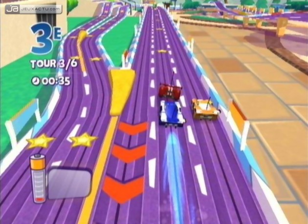 La version Wii ne fait guère mieux quant à elle, puisqu’elle se permet de proposer moins de défis que sa petite sœur sur DS ; et pour ce qui est de l’originalité et du fun, on a vu plus recherché. Le foufoot correspond ici à une sorte de tennis-ballon où chaque point est marqué en faisant trembler les filets de cages positionnées à chaque extrémité du terrain. Autant dire que cette version du foufoot est aussi conceptuelle qu’aléatoire, la faute à un partenaire un peu trop laxiste dans les buts. Le chat fléchettes, bien que facile, s’avère par contre sympathique, puisqu’il s’agit d’une version cour d’école de Ghost Squad et autre Resident Evil : The Umbrella Chronicles. Le pointeur servant non seulement à viser, mais également à se protéger via un bouclier qui apparaît en transparence et qu’il faut orienter, comme dans Dragon Quest Sword. Autre petite épreuve qui mérite un bref coup d’œil : le pilote en papier. Ici, il s’agira de tenir sa Wiimote comme on tiendrait un avion en papier pour contrôler divers engins volants, et récolter un maximum de points ou pour finir le parcours en un temps donné. Si l’usage fait de la Wiimote n’épatera plus grand monde, il faut tout de même avouer que les différents coucous répondent bien et apportent une petite dose de fun que l’on aurait aimé trouver dans l’ensemble des épreuves de cet EA Playground. Les petites voitures, le tetherball ou la balle au mur (le squash des écoliers) n’offrent pour leur part que peu finesse et un contrôle beaucoup trop superficiel de la télécommande gyroscopique. L’incliner à droite ou à gauche pour faire tourner son bolide ou donner des petits coups quand arrive la balle, c’est bien mignon, mais on aimerait quelque chose de plus fin, de moins automatique. Car au même titre qu’un Carnival : Fête Foraine, on sent vite les limites d’un titre développé à la hâte, devant respecter les impératifs d’une sortie pour les fêtes de fin d’année. Mais le titre d’EA fait pire encore. EA Playground se veut trop dirigiste (les mouvements étant trop scriptés) on se contentera d’agiter sans grande conviction une Wiimote qui décidément peine à se renouveler. Pour ce qui est de la convivialité, cette version console de salon est bien évidemment celle à posséder, même si là encore, le manque de consistance du titre se fera vite sentir.