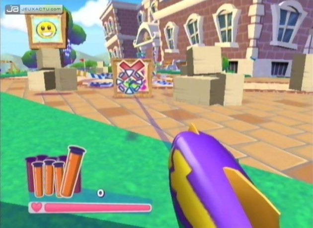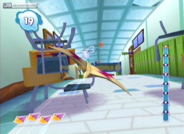 La version Wii ne fait guère mieux quant à elle, puisqu’elle se permet de proposer moins de défis que sa petite sœur sur DS ; et pour ce qui est de l’originalité et du fun, on a vu plus recherché. Le foufoot correspond ici à une sorte de tennis-ballon où chaque point est marqué en faisant trembler les filets de cages positionnées à chaque extrémité du terrain. Autant dire que cette version du foufoot est aussi conceptuelle qu’aléatoire, la faute à un partenaire un peu trop laxiste dans les buts. Le chat fléchettes, bien que facile, s’avère par contre sympathique, puisqu’il s’agit d’une version cour d’école de Ghost Squad et autre Resident Evil : The Umbrella Chronicles. Le pointeur servant non seulement à viser, mais également à se protéger via un bouclier qui apparaît en transparence et qu’il faut orienter, comme dans Dragon Quest Sword. Autre petite épreuve qui mérite un bref coup d’œil : le pilote en papier. Ici, il s’agira de tenir sa Wiimote comme on tiendrait un avion en papier pour contrôler divers engins volants, et récolter un maximum de points ou pour finir le parcours en un temps donné. Si l’usage fait de la Wiimote n’épatera plus grand monde, il faut tout de même avouer que les différents coucous répondent bien et apportent une petite dose de fun que l’on aurait aimé trouver dans l’ensemble des épreuves de cet EA Playground. Les petites voitures, le tetherball ou la balle au mur (le squash des écoliers) n’offrent pour leur part que peu finesse et un contrôle beaucoup trop superficiel de la télécommande gyroscopique. L’incliner à droite ou à gauche pour faire tourner son bolide ou donner des petits coups quand arrive la balle, c’est bien mignon, mais on aimerait quelque chose de plus fin, de moins automatique. Car au même titre qu’un Carnival : Fête Foraine, on sent vite les limites d’un titre développé à la hâte, devant respecter les impératifs d’une sortie pour les fêtes de fin d’année. Mais le titre d’EA fait pire encore. EA Playground se veut trop dirigiste (les mouvements étant trop scriptés) on se contentera d’agiter sans grande conviction une Wiimote qui décidément peine à se renouveler. Pour ce qui est de la convivialité, cette version console de salon est bien évidemment celle à posséder, même si là encore, le manque de consistance du titre se fera vite sentir.