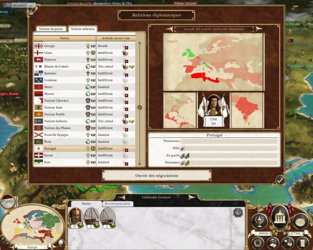 Epoque moderne oblige, Empire Total War se dote d'une nouveauté de taille : les batailles navales ! Si elles ne sont pas forcément aussi passionnantes que les affrontements terrestres, puisque le terrain maritime est désespérément plat, elle enrichissent tout de même agréablement l'action et se révèlent relativement stratégiques. En effet, pour chaque bateau de la flotte, les dégâts sont gérés en trois endroits (coque gauche, coque droite, mâts et voilures) et il est possible de tirer trois types de boulets de canon différents (boulets classique pour percer les coques, boulets à chaîne pour endommager les voiles, et tir de mitraille pour anéantir l'équipage). Ultime raffinement : l'abordage anti-gaspillage, qui permet de prendre possession d'un navire ennemi plutôt que de bêtement le couler. Les batailles mettant en scène infanterie et cavalerie n'ont quant à elles pas énormément évolué depuis les précédents Total War, à ceci près que les armes à feu du XVIIIème siècle rendent les combats au corps à corps moins systématiques. Pour le reste, il s'agit toujours de positionner au mieux ses troupes face à celles de l'adversaire et d'anticiper au maximum les manœuvres de contournement. Naturellement, il reste possible de choisir une résolution automatique du combat si l'on désire se concentrer sur la conquête de territoires au tour par tour. Cette phase bénéficie de multiple améliorations, à commencer par l'arrivée d'un arbre technologique, qui permet d'effectuer des recherches dans des domaines aussi variés que l'art militaire, les sciences ou la philosophie. La manière de gérer l'aspect diplomatique a également été revue. On dispose désormais d'un panneau fort pratique, qui récapitule les relations entre les différentes nations et permet à tout moment de négocier un accord commercial avec l'une, de faire des offrandes à une autre, tout en déclarant la guerre à une troisième... Enfin, il est possible de construire des bâtiments dans les différentes villes de chaque région, et plus seulement dans la capitale. Autant de détails qui améliorent l'expérience de jeu et qui pourraient prendre encore une dimension supplémentaire dans quelques temps, lorsque les développeurs mettront à disposition, via un patch, le mode permettant de jouer la Grande Campagne en un contre un. Cependant, avant de trop nous enthousiasmer sur ce point, gardons à l'esprit qu'il en va des développeurs et éditeurs de jeux vidéo comme des hommes politiques : leurs promesses n'engagent que ceux qui les écoutent...
