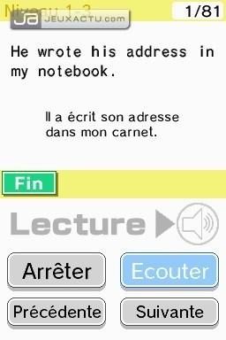Compte-tenu des phrases prononcées dans English Training : Progressez en Anglais sans Stresser, on restera tout de même loin du langage shakespearien, car ce sont bien des expressions communes qui vous permettront de comprendre des conversations de films d’action en VO. Ce qu’un expert ne niera pas puisque la difficulté du jeu est calée sur le TOEIC, qui permet d’attester d’un niveau d’anglais communicatif sans aller dans le littéraire. Intéressant et ludique, ce jeu s’avére réellement efficace dans le cadre d’une utilisation attentive et quotidienne, doté de motivation réelle. Il ne manque plus qu’un jeu adapté Des Chiffres et des Lettres à Nintendo pour voir nos mamies tapoter fébrilement sur leur nouveau joujou (prescription toutefois pour les presbytes, les myopes, les mains tremblotantes et… les non actifs, timing oblige).