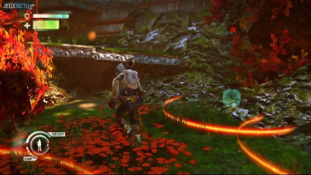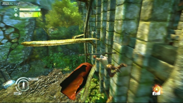 Dans son périple, Monkey a en effet hérité d’une nouvelle copine, pas le genre qu’on emballe à la moindre envie, mais plutôt celle qu’on se coltine par défaut parce qu’elle a réussi à le dompter grâce à une couronne spéciale, lui permettant ainsi de contrôler son esprit à distance. Trip fera donc partie de l’aventure, que l’on veuille ou non. Et si celle-ci a plutôt tendance à freiner notre héros dans ses mouvements (il faudra souvent lui venir en aide, la porter pour passer certains obstacles ou bien encore lui faire la courte-échelle pour lui permettre d’accéder à des corniches a priori inaccessibles), elle lui sera souvent d’une aide précieuse. On pense notamment à sa libellule mécanique qui permet de scanner assez rapidement une zone entière et ainsi repérer les ennemis et autres pièges qu’il va falloir combattre ou éviter. Quoiqu’il en soit, il ne faudra jamais laisser Trip à la merci des adversaires, sa mort provoquant immédiatement celle de Monkey puisque les deux cerveaux de nos héros sont reliés par le biais de cette couronne spéciale. On aurait aimé pouvoir contrôler Trip dans un éventuel mode coopératif, mais hormis des ordres assez simples à lui donner (ne pas bouger, faire diversion ou courir dans une direction), notre jeune femme est prise en charge par l’ordinateur qui s’occupe de tout.