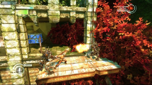En réalité, ce qui fait cruellement défaut à Enslaved, c’est le manque de challenge dont fait preuve le jeu. S’il est évident que les développeurs cherchent à simplifier au plus le gameplay de leur jeu, afin de séduire un plus large public, ces derniers ont tendance parfois à oublier les gamers qui sont habitués à l’exercice, et pour lesquels certains obstacles se passent en un claquement de doigts. Enslaved est loin d’être le jeu le plus difficile, c’est certain, et le nombre trop limité de chapitres ne nous tiendra en haleine qu’une huitaine d’heures de jeu, pas plus. Les plus exigeants noteront également quelques chutes de frame-rate ici et là, un aliasing assez présent et souvent des textures qui mettent du temps à s’afficher convenablement. Rien de bien dramatique dans le fond, mais l’immersion s’en retrouve quelque peu hachée, ce qui ne manquera pas de faire grincer des dents certains joueurs en quête du Saint Graal. Enslaved : Odyssey to the West n’est malheureusement pas le candidat choisi pour endosser un tel rôle (fardeau ?) mais il est suffisamment bien ficelé pour qu’on lui prête une forte attention.