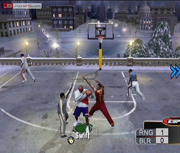 L’intelligence artificielle générale est bien pensée et vos adversaires accentueront plus la pression en fin de match si le score est serré par exemple, multipliant au passage le nombre de fautes. Les lancers francs réclament pas mal de doigté, notamment parce qu’ils jouent sur la sensitivité des gâchettes. L’angle de vue par défaut est totalement injouable mais vous pourrez heureusement passer par le menu "Options" pour y remédier, soit en sélectionnant un autre déjà existant, soit en l’éditant pour l’adapter selon vos envies. Et pour le coup, vous aurez même droit à un petit replay pour les plus belles actions. La réalisation est honorable, notamment grâce à une modélisation des personnages de bonne facture et de nombreux environnements urbains ou intérieurs plutôt bien détaillés. De même, le public est loin d’être statique et s’agite au gré de vos actions et du trémoussement des pom-pom girls. Coté son, les compositions piochent un peu dans tous les styles et pouvoir organiser sa play-list via le juke-box est plus que sympathique, mais avouons le franchement, on est loin des bandes sonores soignées d’Electronic Arts.