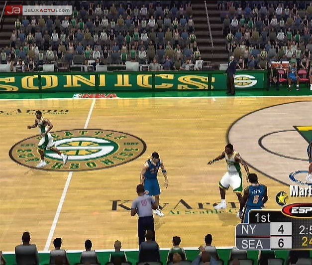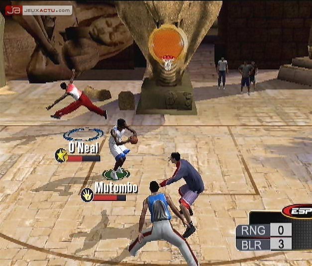 L’intelligence artificielle générale est bien pensée et vos adversaires accentueront plus la pression en fin de match si le score est serré par exemple, multipliant au passage le nombre de fautes. Les lancers francs réclament pas mal de doigté, notamment parce qu’ils jouent sur la sensitivité des gâchettes. L’angle de vue par défaut est totalement injouable mais vous pourrez heureusement passer par le menu "Options" pour y remédier, soit en sélectionnant un autre déjà existant, soit en l’éditant pour l’adapter selon vos envies. Et pour le coup, vous aurez même droit à un petit replay pour les plus belles actions. La réalisation est honorable, notamment grâce à une modélisation des personnages de bonne facture et de nombreux environnements urbains ou intérieurs plutôt bien détaillés. De même, le public est loin d’être statique et s’agite au gré de vos actions et du trémoussement des pom-pom girls. Coté son, les compositions piochent un peu dans tous les styles et pouvoir organiser sa play-list via le juke-box est plus que sympathique, mais avouons le franchement, on est loin des bandes sonores soignées d’Electronic Arts.