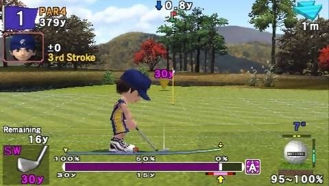 La première qualité d’Everybody's Golf vient de la facilité avec laquelle on prend ce jeu en mains. En effet, pour l’avoir mis entre des mains peu ou prou expertes, le constat reste identique, on s’amuse très rapidement et atteindre le par sur les premiers parcours n’est pas bien compliqué. Le déclenchement des coups se fait en trois temps pour sa partie basique. Le premier d’entre eux consiste en une pression pour le déclenchement, ce qui va faire partir une jauge de puissance. Vous devrez alors appuyer sur la touche Rond une seconde fois pour fixer la puissance de votre coup, la jauge revenant alors vers son point d’origine. La troisième pression va déterminer la précision de votre envoi. Plus vous vous rapprochez du point de départ de votre jauge, plus votre balle atterrira à proximité de l’endroit que vous ciblez. La zone située autour du point de départ / arrivée de votre jauge est d’ailleurs très importante. Le fait de lâcher un coup dans la première zone, teintée de rose, vous assurera une bonne trajectoire sanctionnée d’un ‘Nice Shot’ à l’écran. La zone périphérique, en rouge, entraînera une déviation plus ou moins forte de cette trajectoire. Enfin, si, par malheur, vous pressiez le bouton au delà de cette zone rouge, le résultat serait un coup complètement raté, allant n’importe où. A l’opposé, si vous frappez juste au centre de la zone rose, votre coup sera considéré comme idéal, vous permettant d’imprimer des effets à votre balle. Bien que ces effets ne soient pas indispensables pour achever le jeu, ils seront parfois bien utiles dans certaines situations. La taille de toutes ces zones est fonction de plusieurs facteurs, allant de la nature du terrain (difficile de viser empêtré dans le rough ou un bunker) au type de club que vous utilisez (moins on tape loin, plus il est facile de viser) en passant par les caractéristiques de votre personnage. En effet, chacun des dix golfeurs présents possède 5 attributs : Puissance (la longueur de vos coups), Contrôle (la précision de vos coups), Spin (la capacité à imprimer des effets de spin), Impact (la largeur de votre zone d’impact) et Sidespin (la capacité à imprimer des effets latéraux).