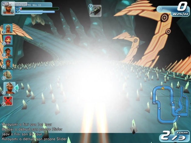 Le NPC chargé des courses nous laisse le choix entre trois modes de jeu : partie instantanée, mode officiel, mode amical. En partie instantanée, ce brave homme se charge de tout et nous envoie directement dans une partie déjà existante ; il ne reste plus alors qu'à attendre que la course démarre. Vient ensuite le mode officiel permettant de disputer une course afin d’améliorer son classement officiel sur le serveur ; chaque victoire ou défaite a donc son importance. Enfin, il y a le mode amical qui sera sûrement le plus fréquenté. Dans ce dernier, on dispute une course à la fin de laquelle nous gagneront de l'argent, des points de grade et d’expérience quel que soit le résultat. Bien sûr, les points attribués varient selon les performances. Contrairement à un Mario Kart pour ne citer que lui, on ne dispose pas d’une super démarrage sur la ligne de départ. Nous avançons donc "tranquillement" à 400 km/h avec notre vaisseau de débutant. L'effet de vitesse n'est pas flagrant visuellement, mais on comprend bien vite qu'un pilotage bourrin ne mènera pas à la victoire. En effet, la maniabilité du vaisseau est loin d'être parfaite, et il faudra donc ralentir dans les virages et éviter de se cogner dans les murs. Pour rattraper efficacement les Sliders qui nous précèdent, il ne faut pas hésiter à consomme les furies. En effet, il est possible de détruire les Sliders qui possèdent chacun une barre de défense et une barre d'exagen. Lorsque la première tombe à zéro c'est l'explosion, et on perdra alors de précieuses secondes le temps que notre Slider réapparaisse à l'arrêt sur la piste. L'exagen, quant à lui, sert à activer des capacités spéciales permettant de pulvériser le vaisseau le plus proche devant nous, ou bien se régénérer. La course s’apparente même parfois à une séance d’esquives rotatives, chacun prenant soin d'éviter les pièges - bombes, bumper, hélices… - éparpillés sur le circuit, lorsqu’il n’est pas occupé à soigner sa conduite, ou prendre un maximum d'accélérateurs. Pour les amateurs de jeux de course, rassurez-vous, plusieurs vues – intérieure, proche, éloignée - sont disponibles. Néanmoins, la vue intérieure présente un sérieux problème : en mode furie, la visibilité est très altérée, voire quasiment réduite à zéro. Autant dire que les compétitions avec le son premier Slider paraissent parfois monotones. Il est difficile de rattraper les concurrents, à part erreur de leur part. D’où l’importance des furies qui permettent de grapiller quelques places au classement. Plus tard dans le jeu, on pourra fixer des armes à l'avant du vaisseau pour rendre les affrontement un peu plus intéressants. En termes de contenu, Exalight propose une quinzaine de courses, avec un niveau de difficulté – facile, moyen, difficile - qui leur est propre. Il existe aussi les arènes qui sont au nombre de trois. Ici, le but est de détruire un maximum de Sliders comme dans un bon vieux Destruction Derby. De petites boules vertes ou bleues sont parsemées dans l'arène permettant de recharger la défense pour les premières, et l'exagen pour les secondes. Le classement est ensuite établi en fonction des points remportés. Bien entendu, les arènes sont bien plus amusantes à jouer lorsque notre Slider possède une arme.