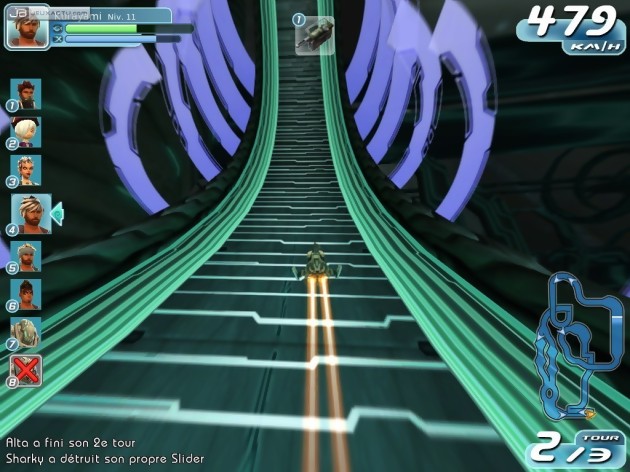 Le NPC chargé des courses nous laisse le choix entre trois modes de jeu : partie instantanée, mode officiel, mode amical. En partie instantanée, ce brave homme se charge de tout et nous envoie directement dans une partie déjà existante ; il ne reste plus alors qu'à attendre que la course démarre. Vient ensuite le mode officiel permettant de disputer une course afin d’améliorer son classement officiel sur le serveur ; chaque victoire ou défaite a donc son importance. Enfin, il y a le mode amical qui sera sûrement le plus fréquenté. Dans ce dernier, on dispute une course à la fin de laquelle nous gagneront de l'argent, des points de grade et d’expérience quel que soit le résultat. Bien sûr, les points attribués varient selon les performances. Contrairement à un Mario Kart pour ne citer que lui, on ne dispose pas d’une super démarrage sur la ligne de départ. Nous avançons donc "tranquillement" à 400 km/h avec notre vaisseau de débutant. L'effet de vitesse n'est pas flagrant visuellement, mais on comprend bien vite qu'un pilotage bourrin ne mènera pas à la victoire. En effet, la maniabilité du vaisseau est loin d'être parfaite, et il faudra donc ralentir dans les virages et éviter de se cogner dans les murs. Pour rattraper efficacement les Sliders qui nous précèdent, il ne faut pas hésiter à consomme les furies. En effet, il est possible de détruire les Sliders qui possèdent chacun une barre de défense et une barre d'exagen. Lorsque la première tombe à zéro c'est l'explosion, et on perdra alors de précieuses secondes le temps que notre Slider réapparaisse à l'arrêt sur la piste. L'exagen, quant à lui, sert à activer des capacités spéciales permettant de pulvériser le vaisseau le plus proche devant nous, ou bien se régénérer. La course s’apparente même parfois à une séance d’esquives rotatives, chacun prenant soin d'éviter les pièges - bombes, bumper, hélices… - éparpillés sur le circuit, lorsqu’il n’est pas occupé à soigner sa conduite, ou prendre un maximum d'accélérateurs. Pour les amateurs de jeux de course, rassurez-vous, plusieurs vues – intérieure, proche, éloignée - sont disponibles. Néanmoins, la vue intérieure présente un sérieux problème : en mode furie, la visibilité est très altérée, voire quasiment réduite à zéro. Autant dire que les compétitions avec le son premier Slider paraissent parfois monotones. Il est difficile de rattraper les concurrents, à part erreur de leur part. D’où l’importance des furies qui permettent de grapiller quelques places au classement. Plus tard dans le jeu, on pourra fixer des armes à l'avant du vaisseau pour rendre les affrontement un peu plus intéressants. En termes de contenu, Exalight propose une quinzaine de courses, avec un niveau de difficulté – facile, moyen, difficile - qui leur est propre. Il existe aussi les arènes qui sont au nombre de trois. Ici, le but est de détruire un maximum de Sliders comme dans un bon vieux Destruction Derby. De petites boules vertes ou bleues sont parsemées dans l'arène permettant de recharger la défense pour les premières, et l'exagen pour les secondes. Le classement est ensuite établi en fonction des points remportés. Bien entendu, les arènes sont bien plus amusantes à jouer lorsque notre Slider possède une arme.